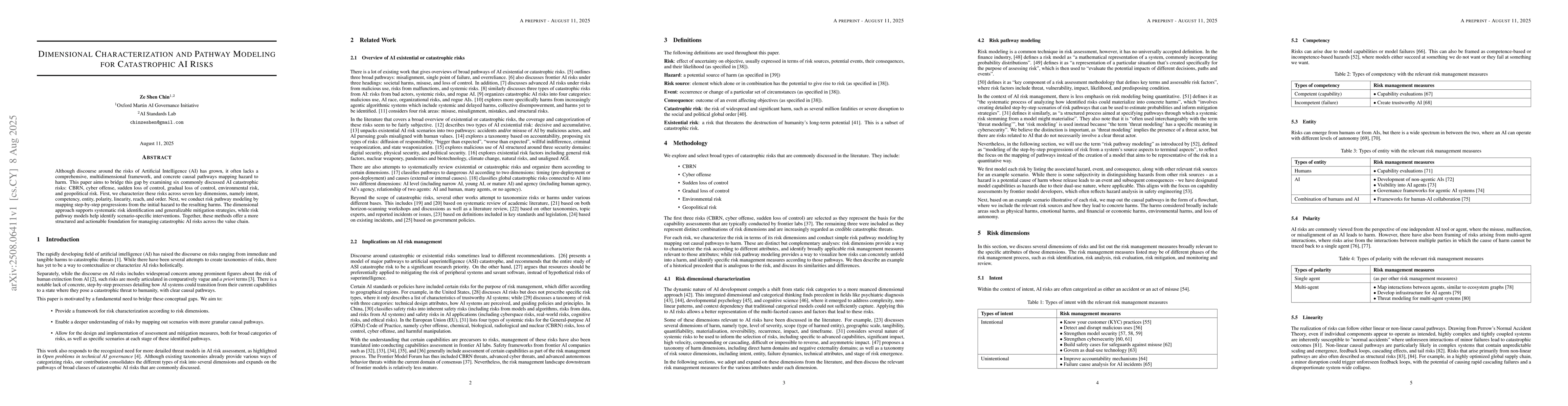 Although discourse around the risks of Artificial Intelligence (AI) has grown, it often lacks a comprehensive, multidimensional framework, and concrete causal pathways mapping hazard to harm. This paper aims to bridge this gap by examining six commonly discussed AI catastrophic risks: CBRN, cyber offense, sudden loss of control, gradual loss of control, environmental risk, and geopolitical risk. First, we characterize these risks across seven key dimensions, namely intent, competency, entity, polarity, linearity, reach, and order. Next, we conduct risk pathway modeling by mapping step-by-step progressions from the initial hazard to the resulting harms. The dimensional approach supports systematic risk identification and generalizable mitigation strategies, while risk pathway models help identify scenario-specific interventions. Together, these methods offer a more structured and actionable foundation for managing catastrophic AI risks across the value chain.