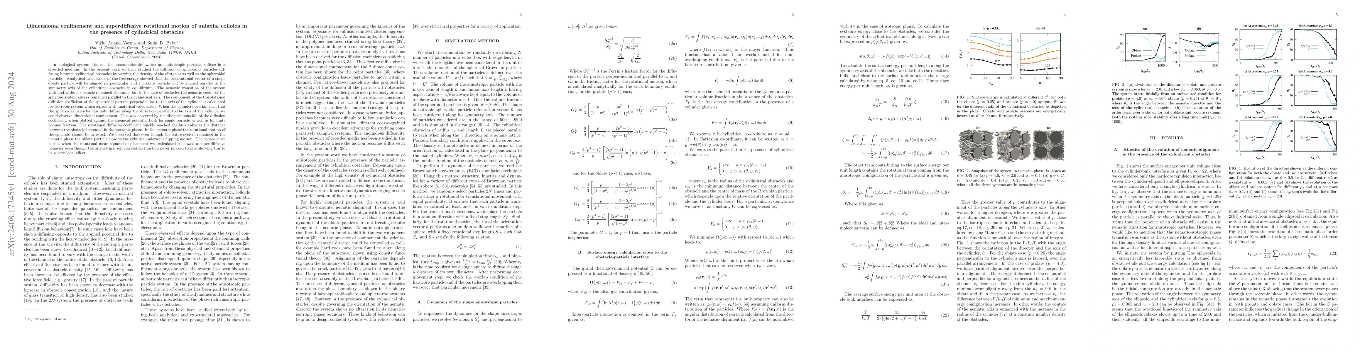 This study investigates the diffusion and rotational motion of uniaxial colloids (spheroidal particles) in a crowded medium with cylindrical obstacles. Analytical calculations show that particles align with obstacles, leading to dimensional confinement and a discontinuous drop in the diffusion coefficient. Superdiffusive rotational motion is observed for nearby oblate particles even in the nematic phase, demonstrating unique dynamics influenced by obstacle presence.