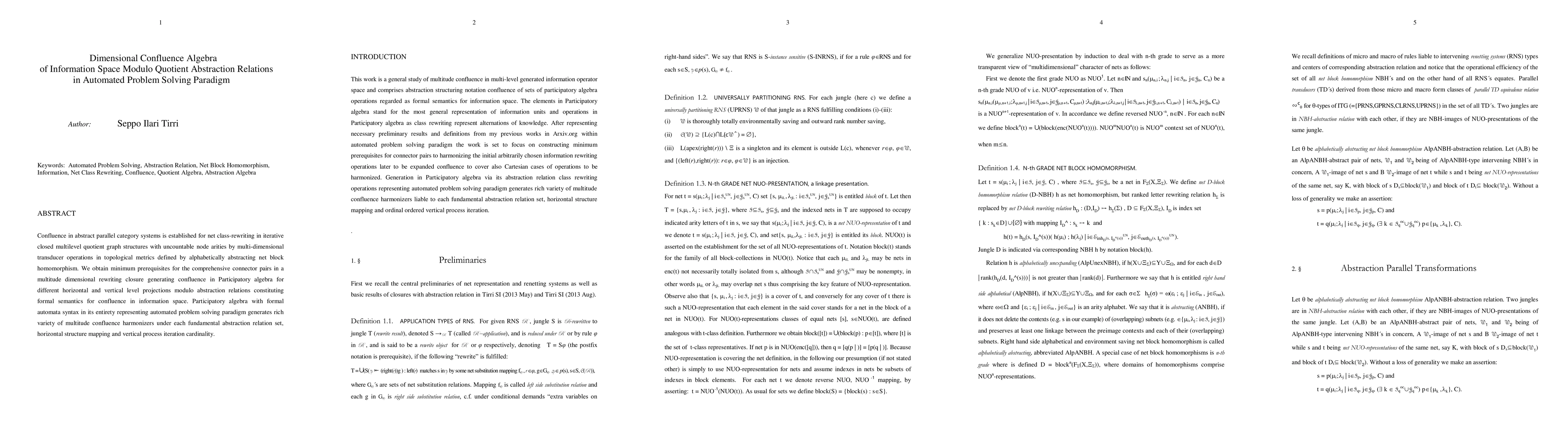 Confluence in abstract parallel category systems is established for net class-rewriting in iterative closed multilevel quotient graph structures with uncountable node arities by multi-dimensional transducer operations in topological metrics defined by alphabetically abstracting net block homomorphism. We obtain minimum prerequisites for the comprehensive connector pairs in a multitude dimensional rewriting closure generating confluence in Participatory algebra for different horizontal and vertical level projections modulo abstraction relations constituting formal semantics for confluence in information space. Participatory algebra with formal automata syntax in its entirety representing automated problem solving paradigm generates rich variety of multitude confluence harmonizers under each fundamental abstraction relation set, horizontal structure mapping and vertical process iteration cardinality.