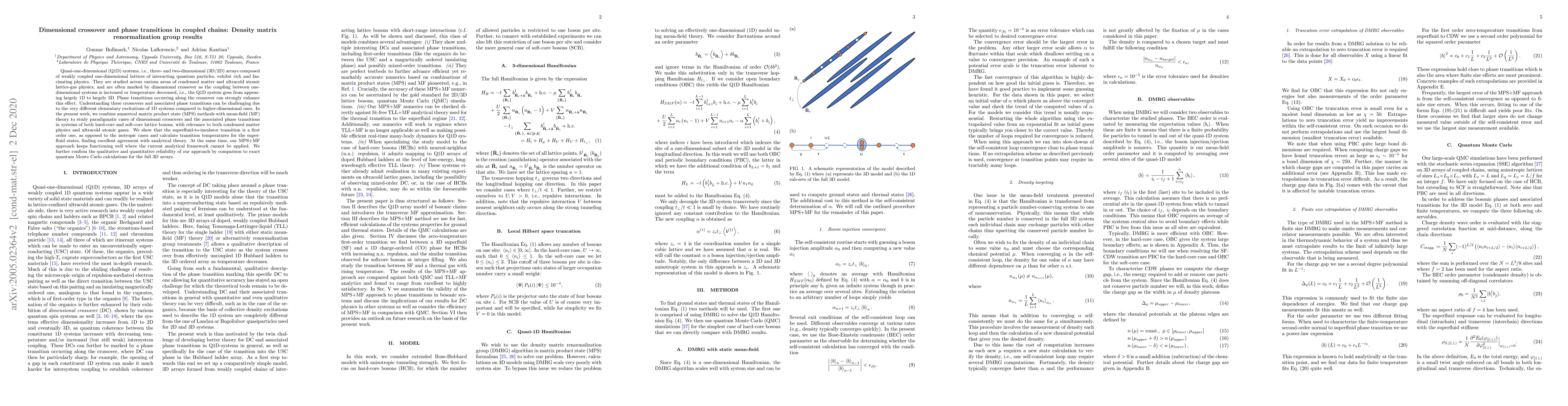 Quasi-one-dimensional (Q1D) systems, i.e., three- and two-dimensional (3D/2D) arrays composed of weakly coupled one-dimensional lattices of interacting quantum particles, exhibit rich and fascinating physics. They are studied across various areas of condensed matter and ultracold atomic lattice-gas physics, and are often marked by dimensional crossover as the coupling between one-dimensional systems is increased or temperature decreased, i.e., the Q1D system goes from appearing largely 1D to largely 3D. Phase transitions occurring along the crossover can strongly enhance this effect. Understanding these crossovers and associated phase transitions can be challenging due to the very different elementary excitations of 1D systems compared to higher-dimensional ones. In the present work, we combine numerical matrix product state (MPS) methods with mean-field (MF) theory to study paradigmatic cases of dimensional crossovers and the associated phase transitions in systems of both hard-core and soft-core lattice bosons, with relevance to both condensed matter physics and ultracold atomic gases. We show that the superfluid-to-insulator transition is a first order one, as opposed to the isotropic cases and calculate transition temperatures for the superfluid states, finding excellent agreement with analytical theory. At the same time, our MPS+MF approach keeps functioning well where the current analytical framework cannot be applied. We further confirm the qualitative and quantitative reliability of our approach by comparison to exact quantum Monte Carlo calculations for the full 3D arrays.