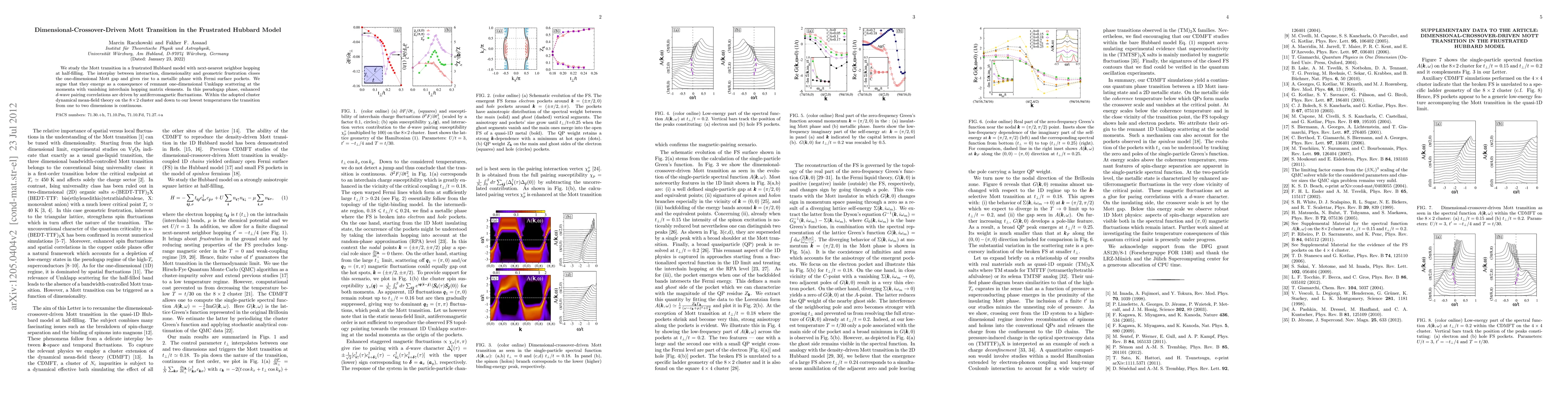 This paper investigates the Mott transition in a frustrated Hubbard model with next-nearest neighbor hopping, revealing that dimensionality and geometric frustration close the one-dimensional Mott gap, leading to a metallic phase with Fermi surface pockets. Enhanced d-wave pairing correlations emerge due to antiferromagnetic fluctuations in this pseudogap phase.