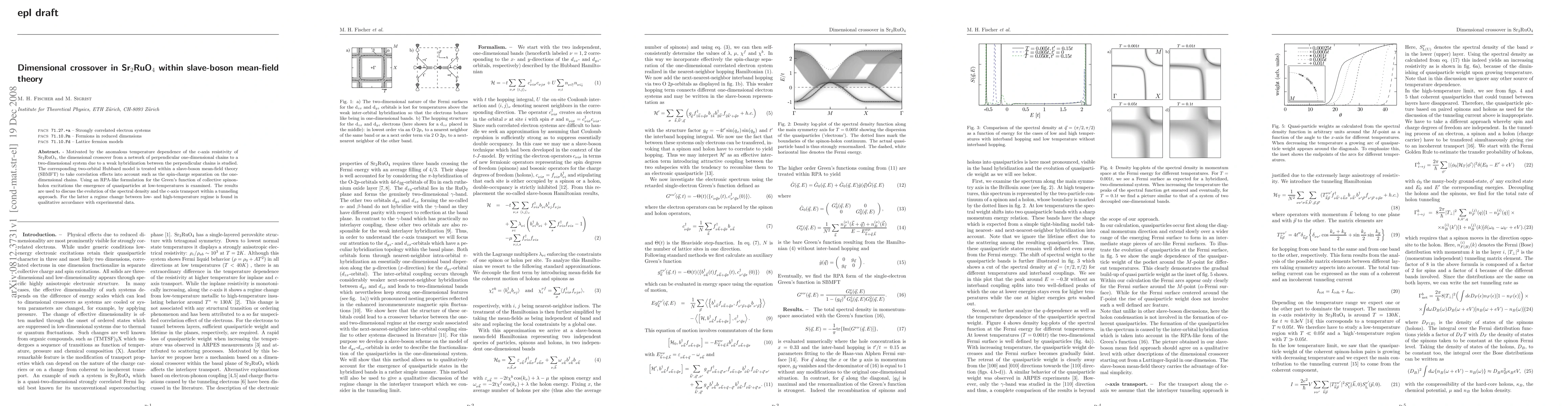 Motivated by the anomalous temperature dependence of the c-axis resistivity of Sr$_2$RuO$_4$, the dimensional crossover from a network of perpendicular one-dimensional chains to a two-dimensional system due to a weak hybridization between the perpendicular chains is studied. The corresponding two-orbital Hubbard model is treated within a slave-boson mean-field theory (SBMFT) to take correlation effects into account such as the spin-charge separation on the one-dimensional chains. Using an RPA-like formulation for the Green's function of collective spinon-holon excitations the emergence of quasiparticles at low-temperatures is examined. The results are used to discuss the evolution of the spectral density and the c-axis transport within a tunneling approach. For the latter a regime change between low- and high-temperature regime is found in qualitative accordance with experimental data.
