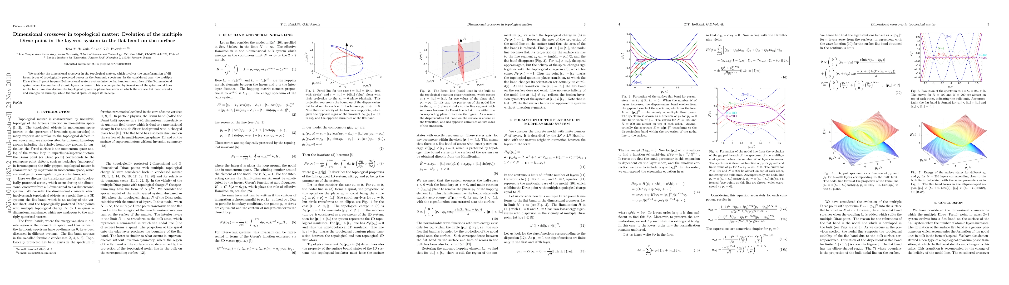 We consider the dimensional crossover in the topological matter, which involves the transformation of different types of topologically protected zeroes in the fermionic spectrum. In the considered case, the multiple Dirac (Fermi) point in quasi 2-dimensional system evolves into the flat band on the surface of the 3-dimensional system when the number of atomic layers increases. This is accompanied by formation of the spiral nodal lines in the bulk. We also discuss the topological quantum phase transition at which the surface flat band shrinks and changes its chirality, while the nodal spiral changes its helicity.