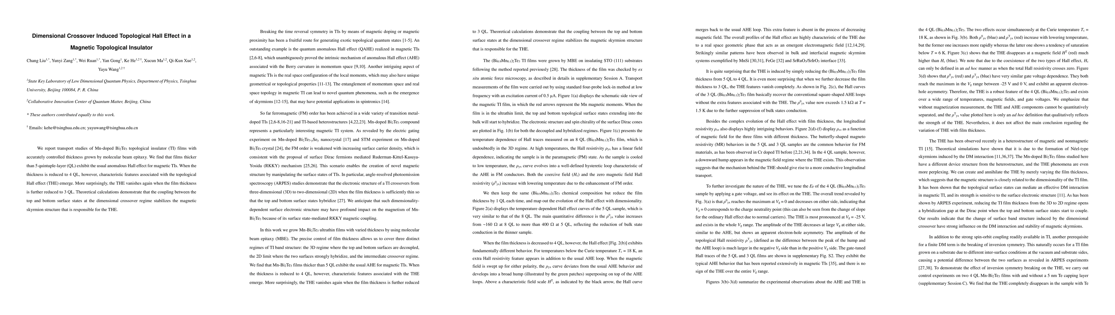 The study reveals that Mn-doped Bi2Te3 topological insulator films show the topological Hall effect at a thickness of 4 quintuple-layer, while the effect vanishes at 3 QL, indicating the influence of dimensional crossover on the magnetic skyrmion structure. Theoretical calculations suggest that coupling between surface states stabilizes this structure.