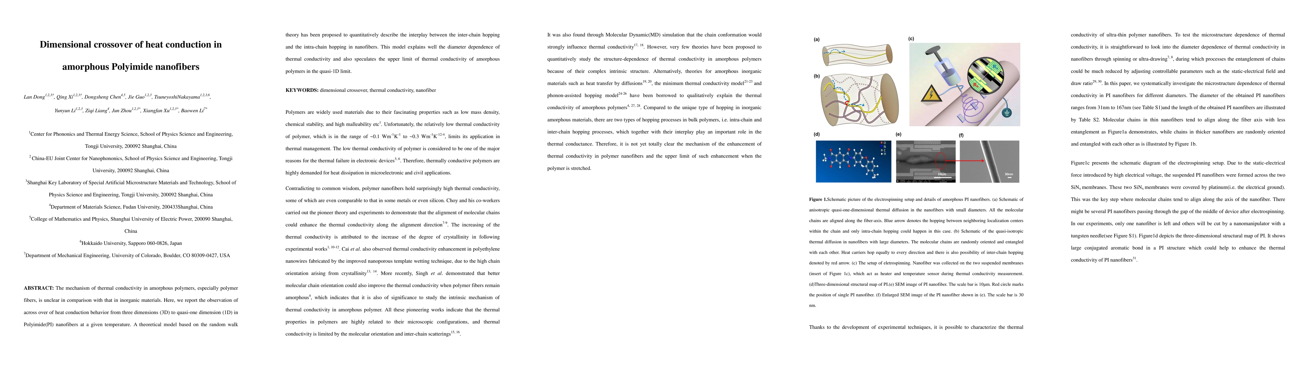 This study observes the dimensional crossover in heat conduction from 3D to quasi-1D in Polyimide nanofibers, proposing a random walk theory model to describe the thermal conductivity dynamics. The model effectively explains the diameter dependence and suggests the upper limit of thermal conductivity for amorphous polymers in the quasi-1D regime.