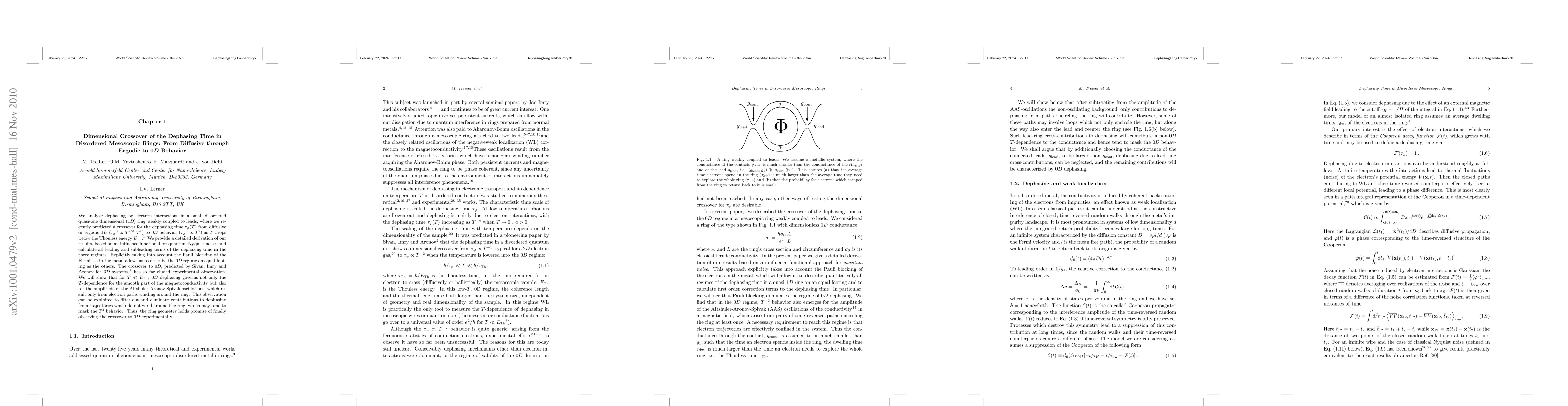 We analyze dephasing by electron interactions in a small disordered quasi-one dimensional (1D) ring weakly coupled to leads, where we recently predicted a crossover for the dephasing time $\tPh(T)$ from diffusive or ergodic 1D ($\tPh^{-1} \propto T^{2/3}, T^{1}$) to $0D$ behavior ($\tPh^{-1} \propto T^{2}$) as $T$ drops below the Thouless energy $\ETh$. We provide a detailed derivation of our results, based on an influence functional for quantum Nyquist noise, and calculate all leading and subleading terms of the dephasing time in the three regimes. Explicitly taking into account the Pauli blocking of the Fermi sea in the metal allows us to describe the $0D$ regime on equal footing as the others. The crossover to $0D$, predicted by Sivan, Imry and Aronov for 3D systems, has so far eluded experimental observation. We will show that for $T \ll \ETh$, $0D$ dephasing governs not only the $T$-dependence for the smooth part of the magnetoconductivity but also for the amplitude of the Altshuler-Aronov-Spivak oscillations, which result only from electron paths winding around the ring. This observation can be exploited to filter out and eliminate contributions to dephasing from trajectories which do not wind around the ring, which may tend to mask the $T^{2}$ behavior. Thus, the ring geometry holds promise of finally observing the crossover to $0D$ experimentally.