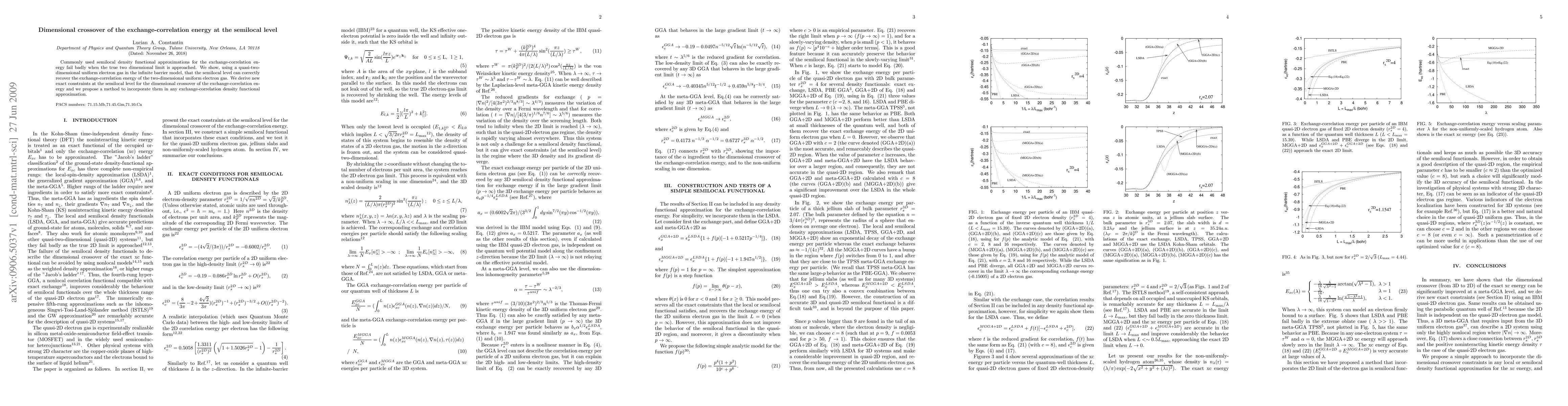 This paper demonstrates that semilocal density functional approximations can accurately recover the exchange-correlation energy for quasi-two-dimensional electron systems, providing new exact constraints and proposing a method to incorporate these for better dimensional crossover predictions.