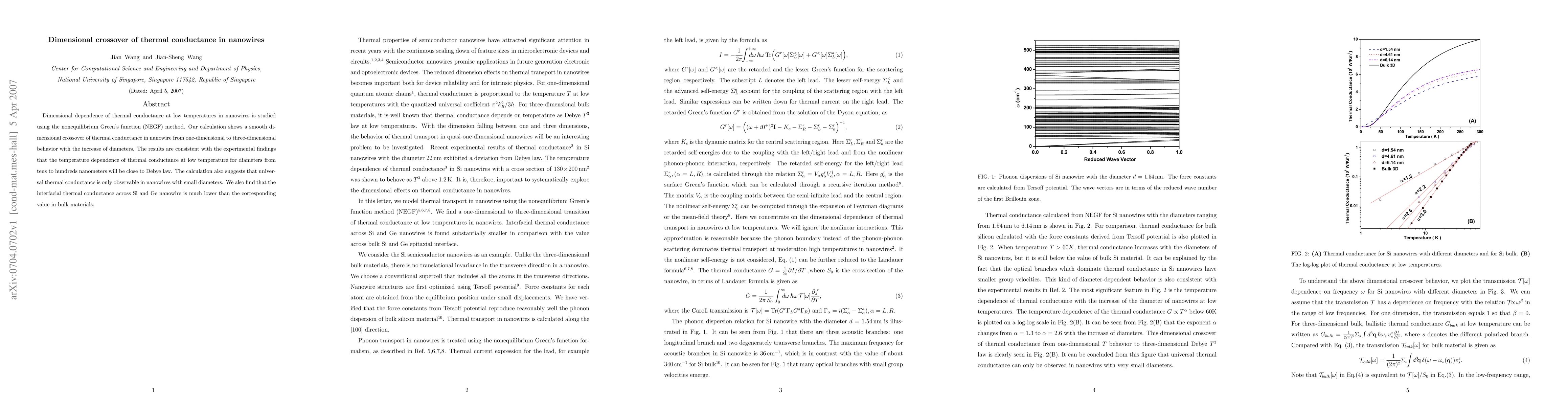 This paper investigates the dimensional crossover of thermal conductance in nanowires using the nonequilibrium Green's function method, revealing that thermal conductance transitions smoothly from one-dimensional to three-dimensional behavior with increasing diameters. The findings align with experimental data showing Debye law's applicability for nanowires with diameters in the nanometer range, and indicate lower interfacial thermal conductance in Si and Ge nanowires compared to bulk materials.