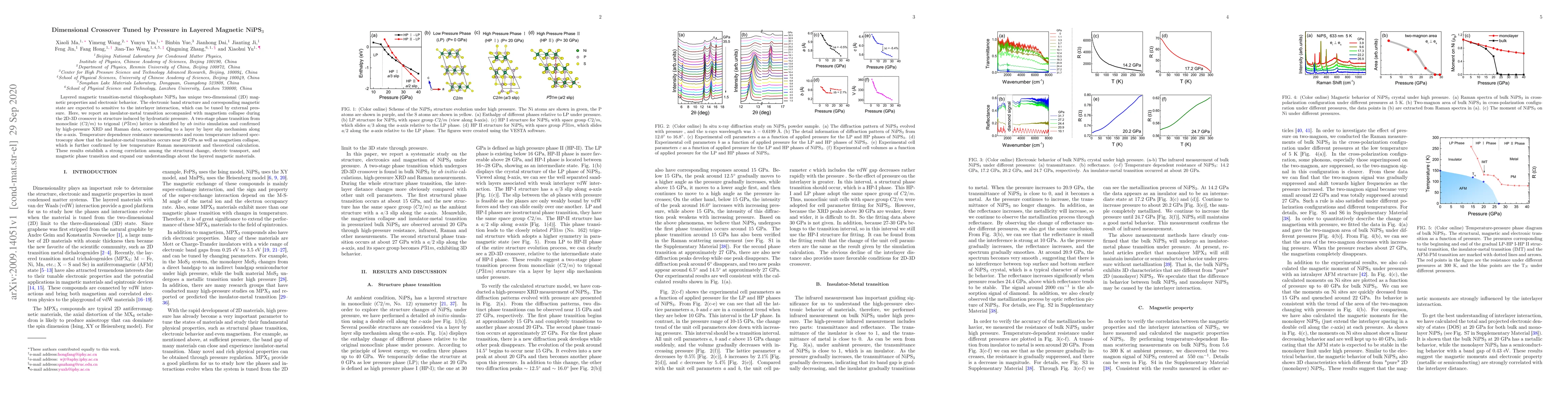 This study investigates the pressure-induced dimensional crossover in NiPS3, revealing an insulator-metal transition and magnetism collapse at 20 GPa. The structural transition from monoclinic to trigonal phases is confirmed via high-pressure XRD and Raman spectroscopy, highlighting the interplay between structural, electronic, and magnetic properties in layered magnetic materials.