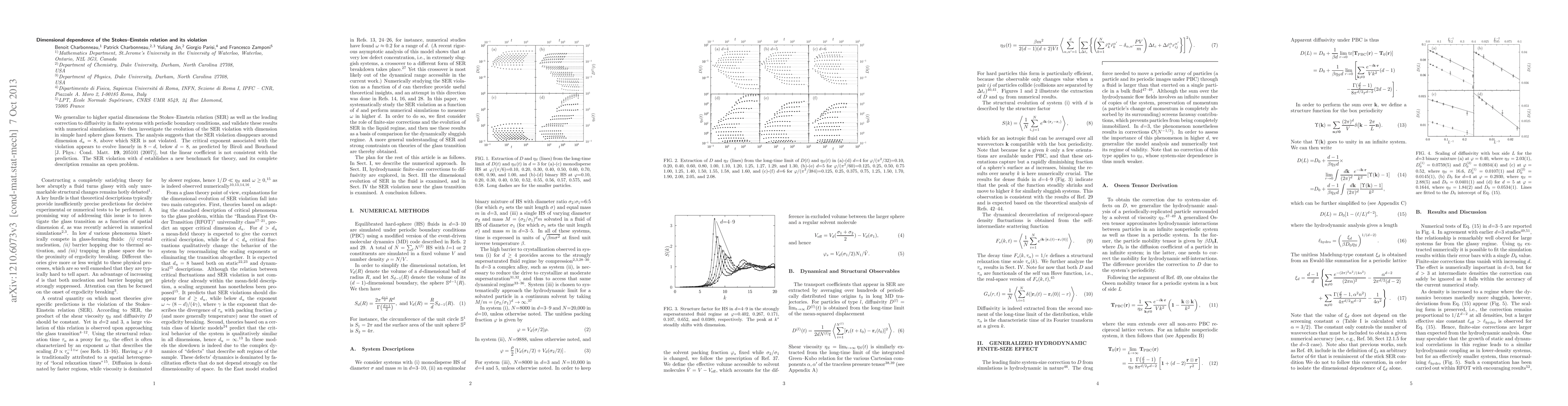 We generalize to higher spatial dimensions the Stokes--Einstein relation (SER) and the leading correction to diffusivity in periodic systems, and validate them using numerical simulations. Using these results, we investigate the evolution of the SER violation with dimension in simple hard sphere glass formers. The analysis suggests that the SER violation disappears around dimension d=8, above which SER is not violated. The critical exponent associated to the violation appears to evolve linearly in 8-d below d=8, as predicted by Biroli and Bouchaud [J. Phys.: Cond. Mat. 19, 205101 (2007)], but the linear coefficient is not consistent with their prediction. The SER violation evolution with d establishes a new benchmark for theory, and a complete description remains an open problem.