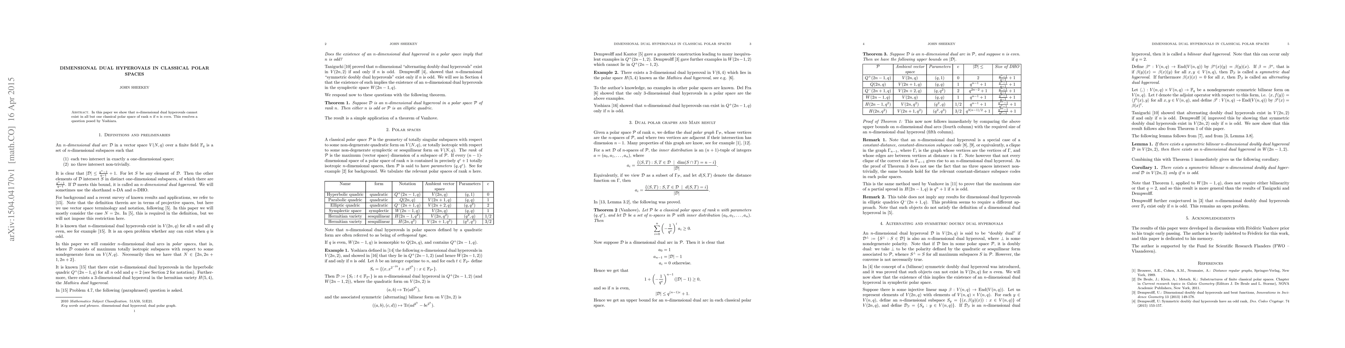 Summary: The paper demonstrates that n-dimensional dual hyperovals do not exist in all but one classical polar space of rank n when n is even, resolving a question previously posed by Yoshiara. This finding provides significant insight into the structure of classical polar spaces.