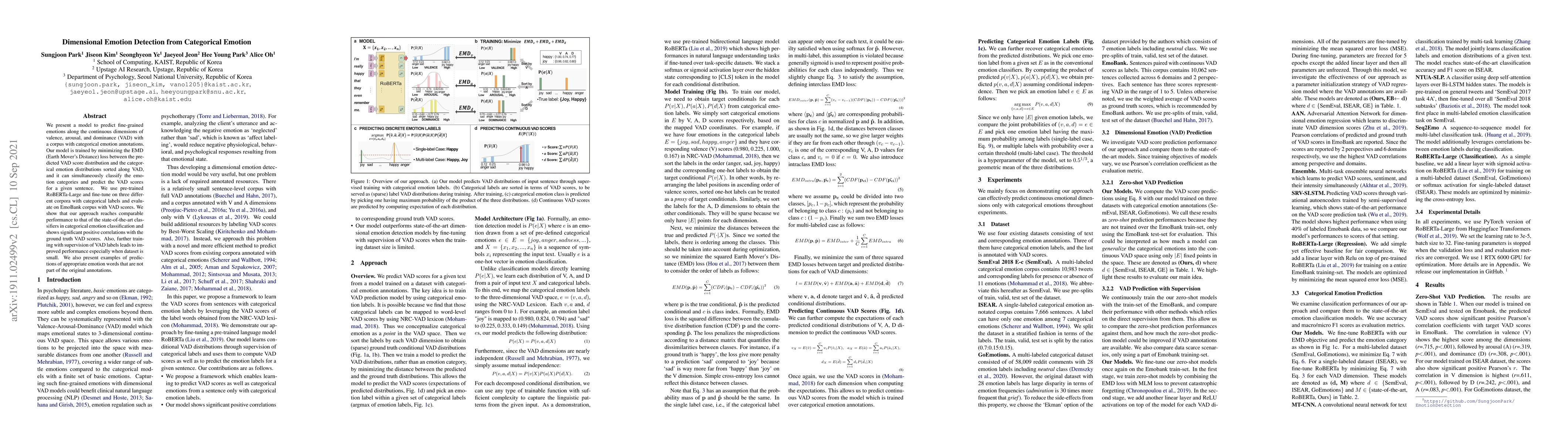 This paper proposes a model to predict fine-grained emotions using continuous valence, arousal, and dominance (VAD) dimensions, trained to minimize Earth Mover's Distance loss. It achieves comparable performance in categorical emotion classification and correlates well with VAD scores, with further VAD supervision improving results, especially on small datasets.