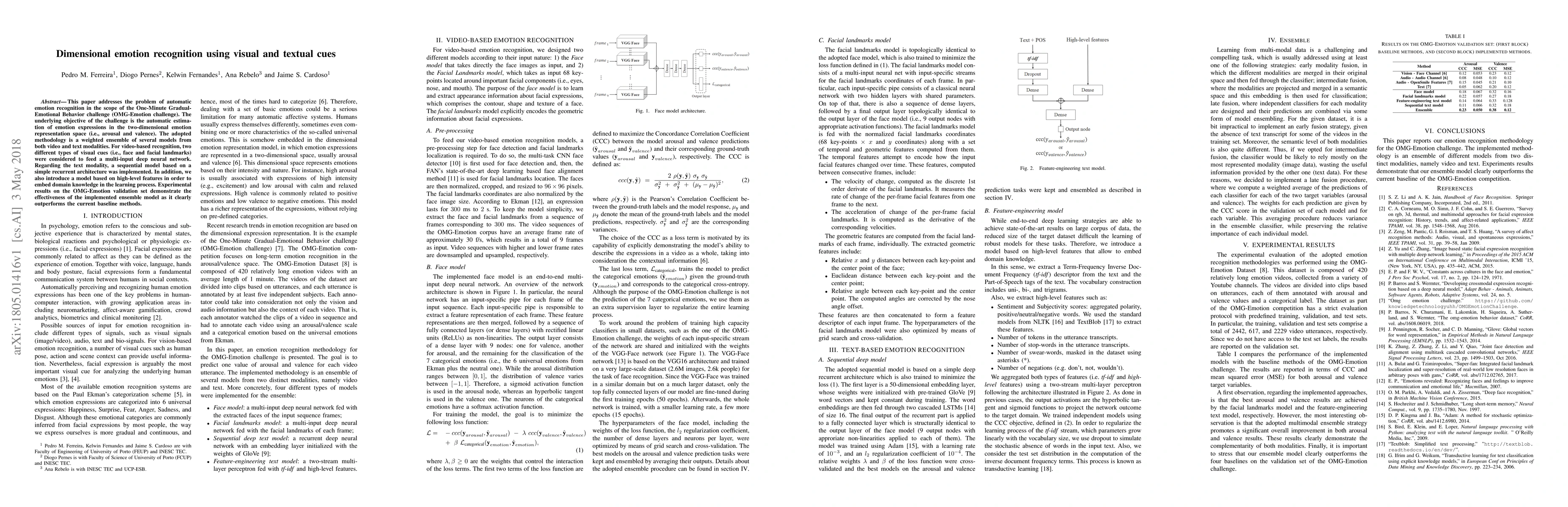 This paper addresses the problem of automatic emotion recognition in the scope of the One-Minute Gradual-Emotional Behavior challenge (OMG-Emotion challenge). The underlying objective of the challenge is the automatic estimation of emotion expressions in the two-dimensional emotion representation space (i.e., arousal and valence). The adopted methodology is a weighted ensemble of several models from both video and text modalities. For video-based recognition, two different types of visual cues (i.e., face and facial landmarks) were considered to feed a multi-input deep neural network. Regarding the text modality, a sequential model based on a simple recurrent architecture was implemented. In addition, we also introduce a model based on high-level features in order to embed domain knowledge in the learning process. Experimental results on the OMG-Emotion validation set demonstrate the effectiveness of the implemented ensemble model as it clearly outperforms the current baseline methods.