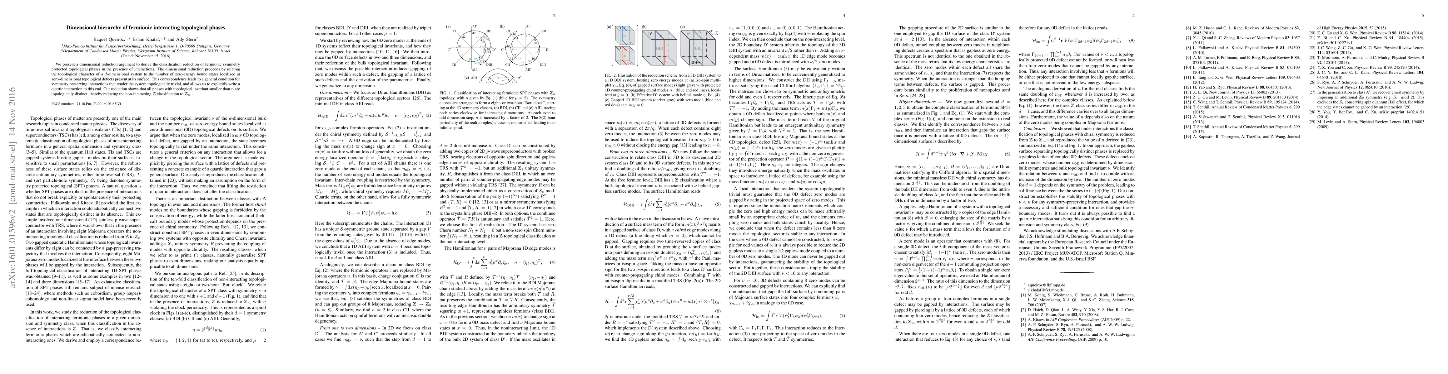 This paper classifies fermionic interacting topological phases through dimensional reduction, linking the topological character of $d$-dimensional systems to zero-energy bound states at zero-dimensional defects. It derives a condition for interactions that make the system topologically trivial and reduces the non-interacting $\mathbb{Z}$ classification to $\mathbb{Z}_n$.