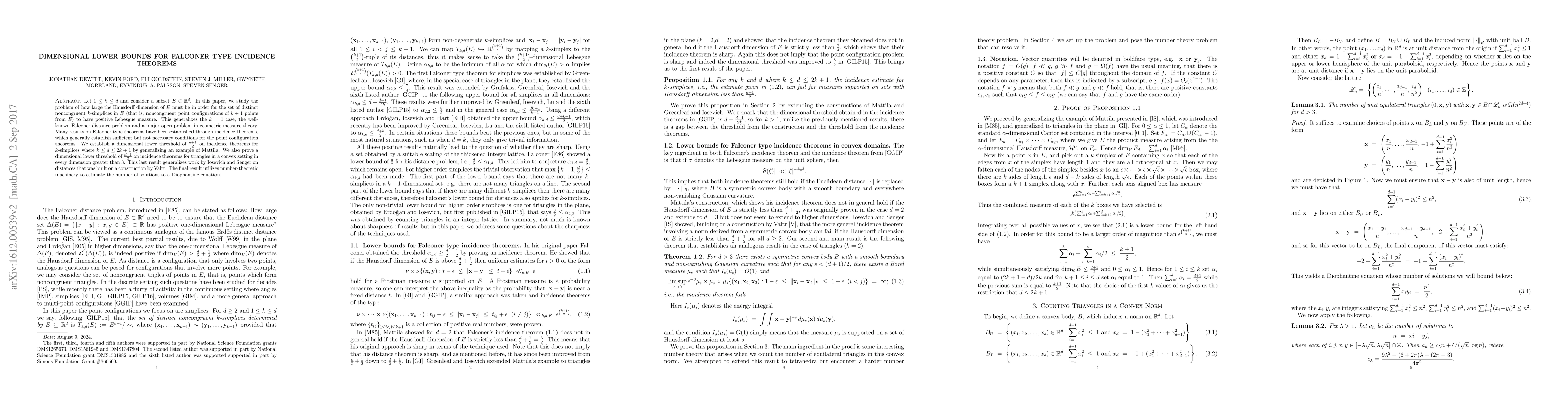 Let $1 \leq k \leq d$ and consider a subset $E\subset \mathbb{R}^d$. In this paper, we study the problem of how large the Hausdorff dimension of $E$ must be in order for the set of distinct noncongruent $k$-simplices in $E$ (that is, noncongruent point configurations of $k+1$ points from $E$) to have positive Lebesgue measure. This generalizes the $k=1$ case, the well-known Falconer distance problem and a major open problem in geometric measure theory. We establish a dimensional lower threshold of $\frac{d(k+1)}{d+2}$ for Falconer type theorems for $k$-simplices. This threshold is nontrivial in the range $d/2 \leq k \leq d$ and is obtained through counting simplices in a standard lattice using results of the Gauss circle problem. Many results on Falconer type theorems have been established through incidence theorems, which generally establish sufficient but not necessary conditions for the point configuration theorems. We also establish a dimensional lower threshold of $\frac{d+1}{2}$ on incidence theorems for $k$-simplices where $k\leq d \leq 2k+1$ by generalizing an example of Mattila. Finally, we prove a dimensional lower threshold of $\frac{d+1}{2}$ on incidence theorems for triangles in a convex setting in every dimension greater than $3$. This last result generalizes work by Iosevich and Senger on distances that was built on a construction by Valtr. The final result utilizes number-theoretic machinery to estimate the number of solutions to a Diophantine equation.