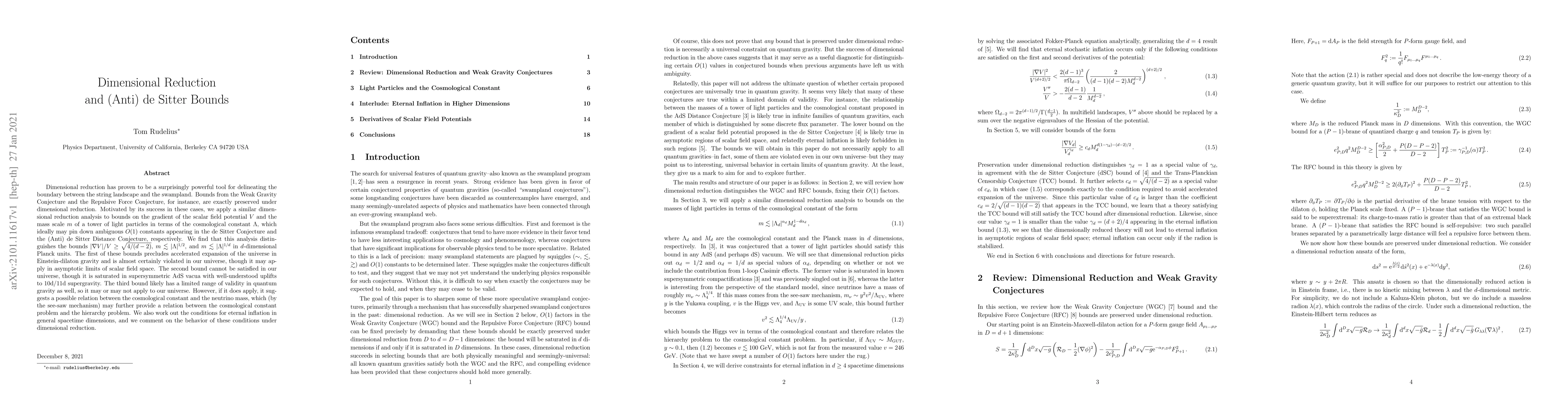 Dimensional reduction has proven to be a surprisingly powerful tool for delineating the boundary between the string landscape and the swampland. Bounds from the Weak Gravity Conjecture and the Repulsive Force Conjecture, for instance, are exactly preserved under dimensional reduction. Motivated by its success in these cases, we apply a similar dimensional reduction analysis to bounds on the gradient of the scalar field potential $V$ and the mass scale $m$ of a tower of light particles in terms of the cosmological constant $\Lambda$, which ideally may pin down ambiguous $O(1)$ constants appearing in the de Sitter Conjecture and the (Anti) de Sitter Distance Conjecture, respectively. We find that this analysis distinguishes the bounds $|\nabla V|/V \geq \sqrt{4/(d-2)}$, $m \lesssim |\Lambda|^{1/2}$, and $m \lesssim |\Lambda|^{1/d}$ in $d$-dimensional Planck units. The first of these bounds precludes accelerated expansion of the universe in Einstein-dilaton gravity and is almost certainly violated in our universe, though it may apply in asymptotic limits of scalar field space. The second bound cannot be satisfied in our universe, though it is saturated in supersymmetric AdS vacua with well-understood uplifts to 10d/11d supergravity. The third bound likely has a limited range of validity in quantum gravity as well, so it may or may not apply to our universe. However, if it does apply, it suggests a possible relation between the cosmological constant and the neutrino mass, which (by the see-saw mechanism) may further provide a relation between the cosmological constant problem and the hierarchy problem. We also work out the conditions for eternal inflation in general spacetime dimensions, and we comment on the behavior of these conditions under dimensional reduction.