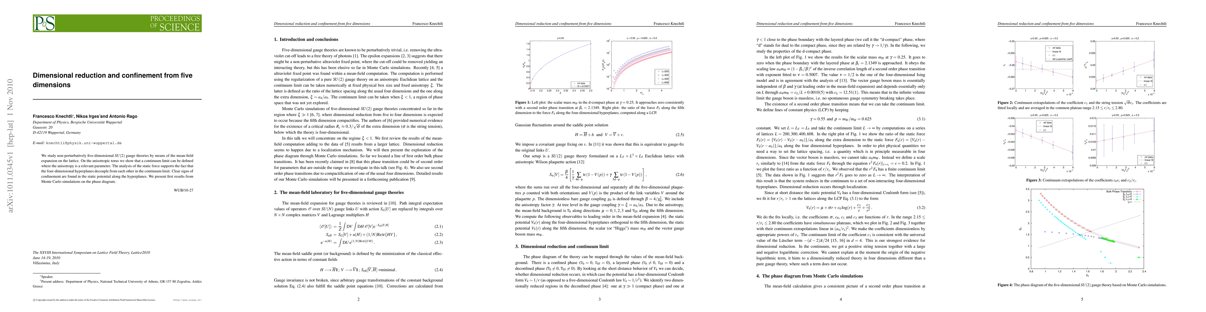 We study non-perturbatively five-dimensional SU(2) gauge theories by means of the mean-field expansion on the lattice. On the anisotropic torus we show that a continuum limit can be defined where the anisotropy is a relevant parameter. The analysis of the static force supports the fact that the four-dimensional hyperplanes decouple from each other in the continuum limit. Clear signs of confinement are found in the static potential along the hyperplanes. We present first results from Monte Carlo simulations on the phase diagram.