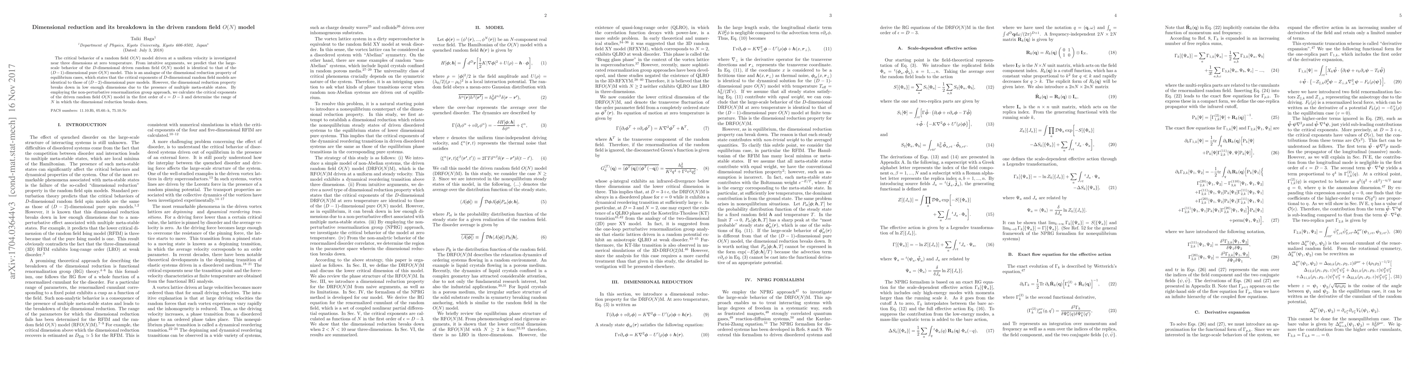This paper investigates the critical behavior of the driven random field $O(N)$ model at zero temperature, introducing a dimensional reduction property that relates the $D$-dimensional model to the $(D-1)$-dimensional pure $O(N)$ model. However, this property breaks down in low dimensions due to multiple meta-stable states, with the critical exponents calculated near three dimensions to determine the breakdown range for $N$.