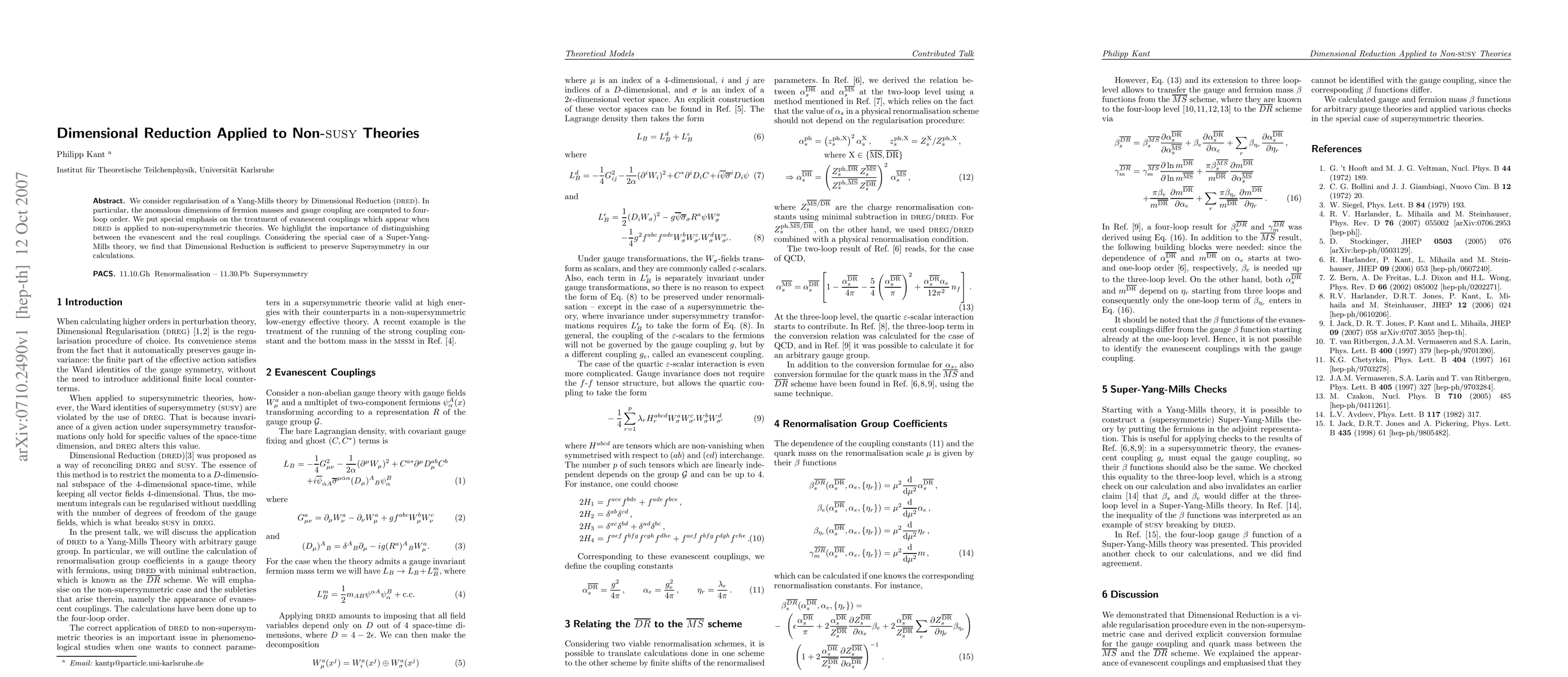 This paper investigates the regularization of Yang-Mills theory via Dimensional Reduction (DRED), focusing on the computation of anomalous dimensions to four-loop order. It emphasizes the treatment of evanescent couplings in non-supersymmetric theories and highlights the importance of distinguishing them from real couplings, while confirming the preservation of Supersymmetry in Super-Yang-Mills theory through DRED.