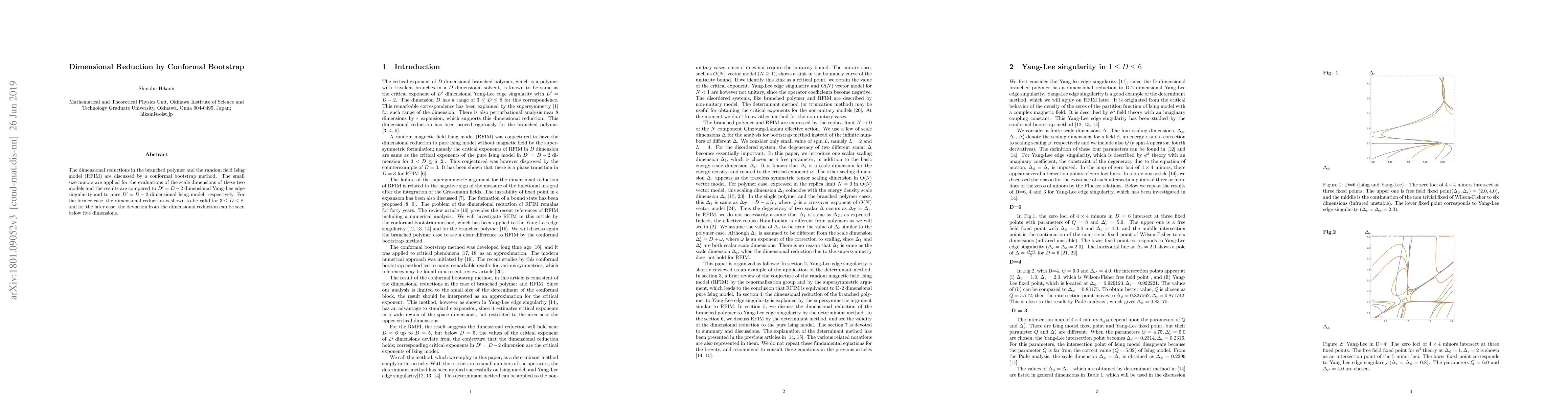 The dimensional reductions in the branched polymer and the random field Ising model (RFIM) are discussed by a conformal bootstrap method. The small size minors are applied for the evaluations of the scale dimensions of these two models and the results are compared to D'=D-2 dimensional Yang-Lee edge singularity and to pure D'=D-2 dimensional Ising model, respectively. For the former case, the dimensional reduction is shown to be valid for $3 \le D \le 8$, and for the latter case, the deviation from the dimensional reduction can be seen below five dimensions.