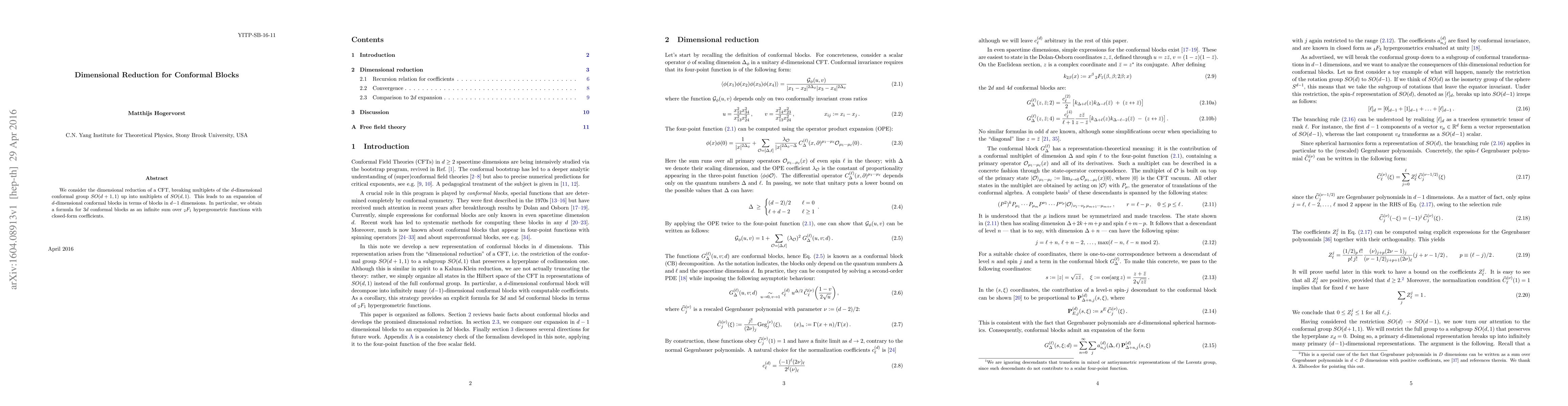 This paper explores the dimensional reduction of conformal field theories (CFTs), breaking d-dimensional conformal multiplets into d-1 dimensions and deriving an expansion formula for 3d conformal blocks using hypergeometric functions.