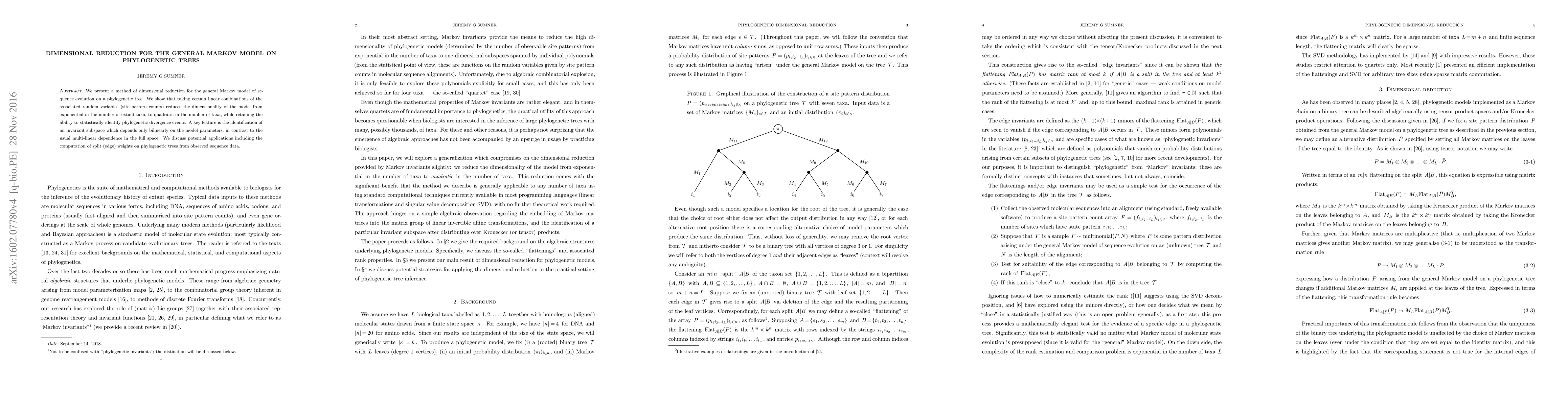 We present a method of dimensional reduction for the general Markov model of sequence evolution on a phylogenetic tree. We show that taking certain linear combinations of the associated random variables (site pattern counts) reduces the dimensionality of the model from exponential in the number of extant taxa, to quadratic in the number of taxa, while retaining the ability to statistically identify phylogenetic divergence events. A key feature is the identification of an invariant subspace which depends only bilinearly on the model parameters, in contrast to the usual multi-linear dependence in the full space. We discuss potential applications including the computation of split (edge) weights on phylogenetic trees from observed sequence data.
