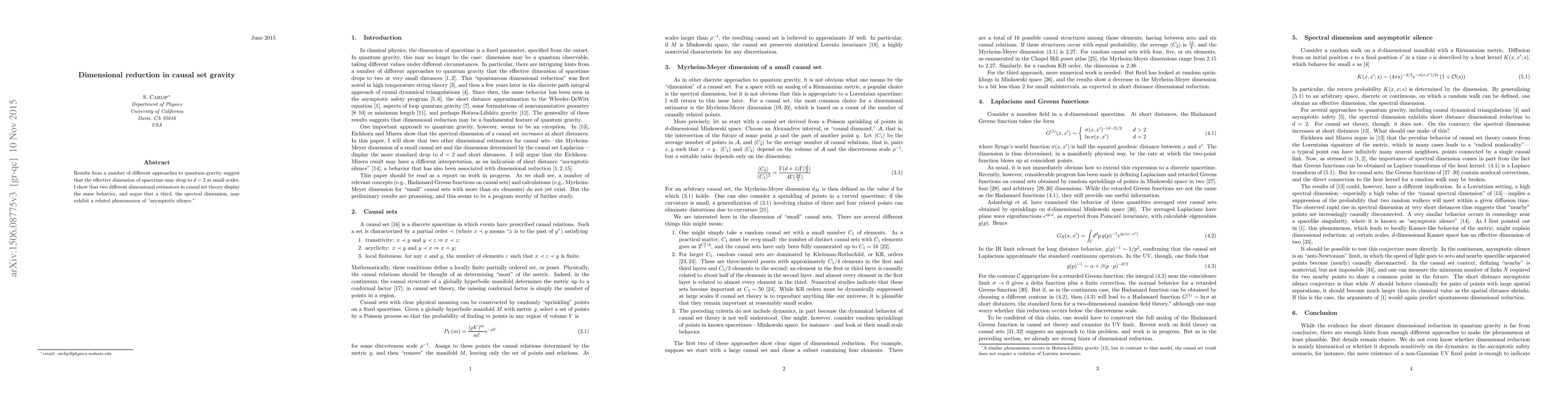 This paper demonstrates that causal set theory, a framework for quantum gravity, indicates a reduction in effective spacetime dimension to $d=2$ at small scales, using two dimensional estimators and suggesting a potential "asymptotic silence" for a third estimator.