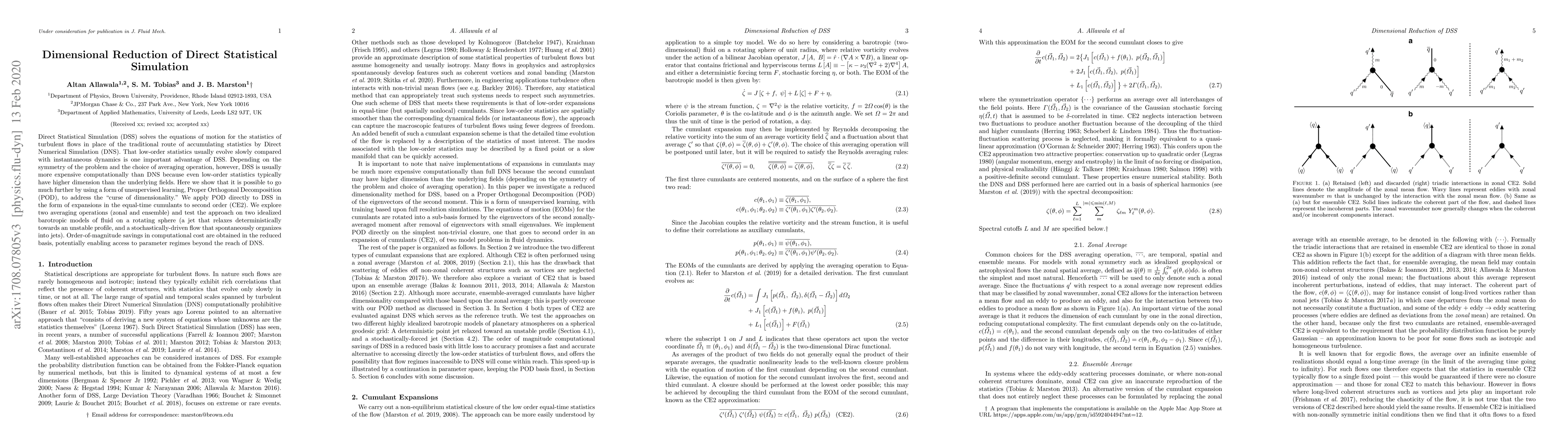 This paper demonstrates the use of Proper Orthogonal Decomposition (POD) to significantly reduce the computational cost of Direct Statistical Simulation (DSS) by addressing the "curse of dimensionality." It applies POD to DSS expansions in equal-time cumulants to second order (CE2) and achieves order-of-magnitude savings in computational cost for idealized barotropic models on a rotating sphere.