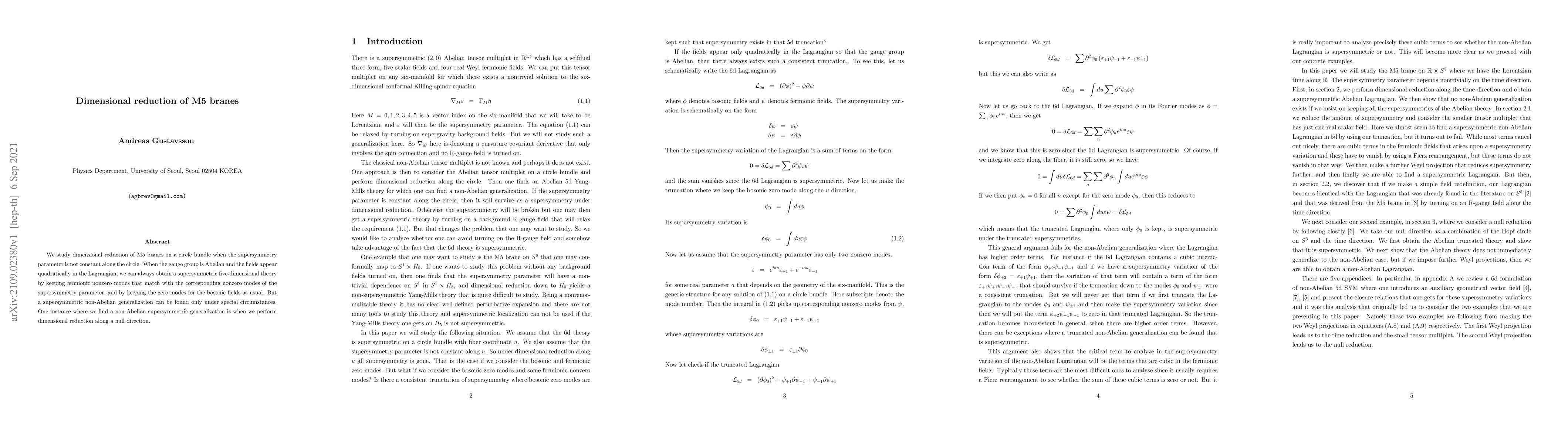 This paper investigates the dimensional reduction of M5 branes on a circle bundle, focusing on scenarios where the supersymmetry parameter varies. It finds that an Abelian gauge group with quadratic field terms allows for a five-dimensional supersymmetric theory, while a non-Abelian generalization is only feasible under specific conditions, such as reduction along a null direction.