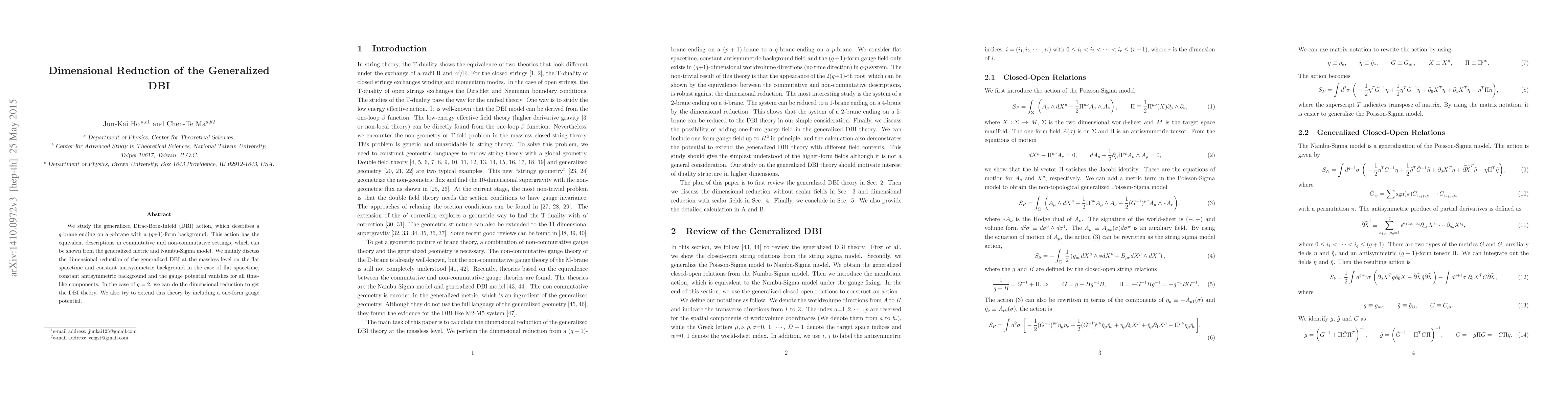 We study the generalized Dirac-Born-Infeld (DBI) action, which describes a $q$-brane ending on a $p$-brane with a ($q$+1)-form background. This action has the equivalent descriptions in commutative and non-commutative settings, which can be shown from the generalized metric and Nambu-Sigma model. We mainly discuss the dimensional reduction of the generalized DBI at the massless level on the flat spacetime and constant antisymmetric background in the case of flat spacetime, constant antisymmetric background and the gauge potential vanishes for all time-like components. In the case of $q=2$, we can do the dimensional reduction to get the DBI theory. We also try to extend this theory by including a one-form gauge potential.