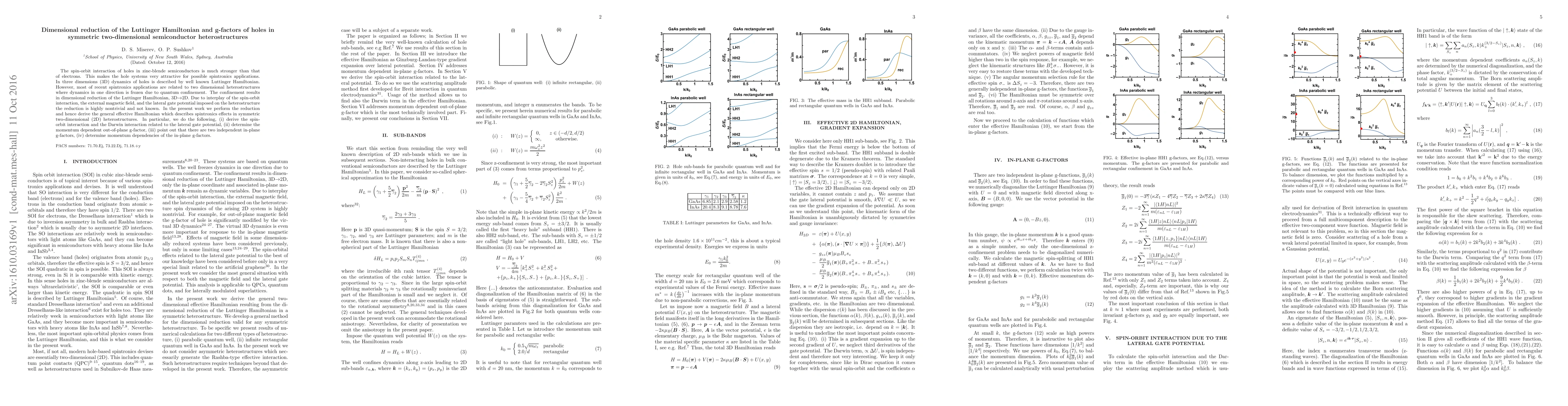 The spin-orbit interaction of holes in zinc-blende semiconductors is much stronger than that of electrons. This makes the hole systems very attractive for possible spintronics applications. In three dimensions (3D) dynamics of holes is described by well known Luttinger Hamiltonian. However, most of recent spintronics applications are related to two dimensional heterostructures where dynamics in one direction is frozen due to quantum confinement. The confinement results in dimensional reduction of the Luttinger Hamiltonian, 3D ->2D. Due to interplay of the spin-orbit interaction, the external magnetic field, and the lateral gate potential imposed on the heterostructure the reduction is highly nontrivial and not known. In the present work we perform the reduction and hence derive the general effective Hamiltonian which describes spintronics effects in symmetric two-dimensional (2D) heterostructures. In particular, we do the following, (i) derive the spin-orbit interaction and the Darwin interaction related to the lateral gate potential, (ii) determine the momentum dependent out-of-plane g-factor, (iii) point out that there are two independent in-plane g-factors, (iv) determine momentum dependencies of the in-plane g-factors.