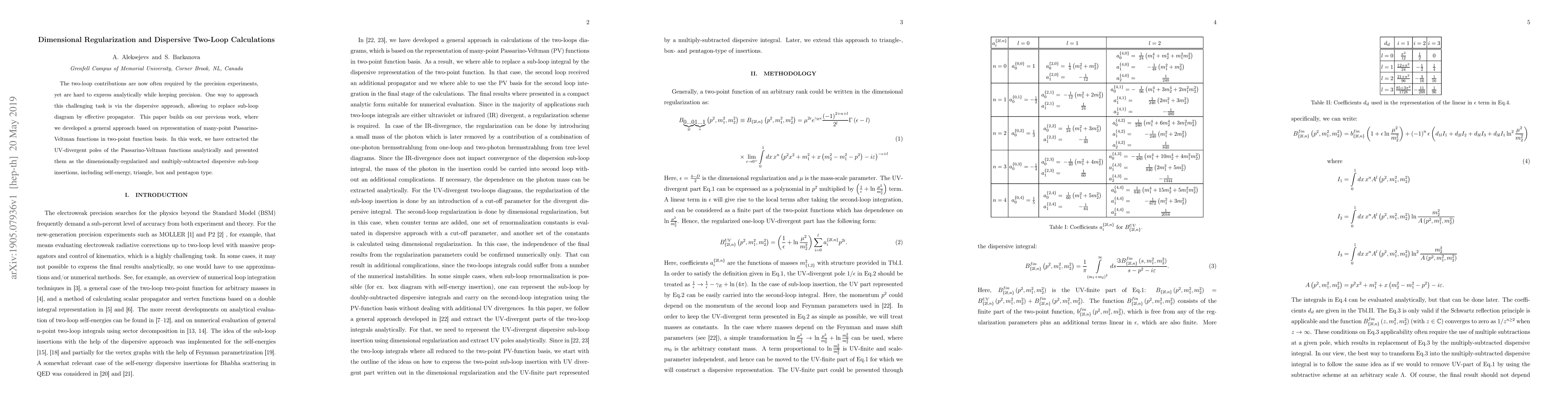 The two-loop contributions are now often required by the precision experiments, yet are hard to express analytically while keeping precision. One way to approach this challenging task is via the dispersive approach, allowing to replace sub-loop diagram by effective propagator. This paper builds on our previous work, where we developed a general approach based on representation of many-point Passarino-Veltman functions in two-point function basis. In this work, we have extracted the UV-divergent poles of the Passarino-Veltman functions analytically and presented them as the dimensionally-regularized and multiply-subtracted dispersive sub-loop insertions, including self-energy, triangle, box and pentagon type.