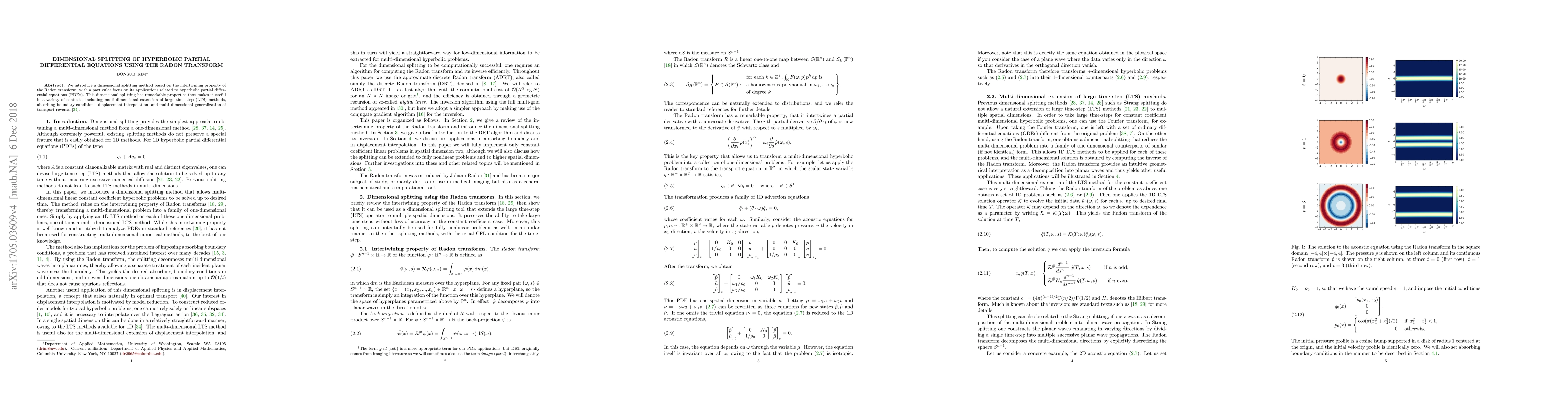 This paper proposes a dimensional splitting method for hyperbolic PDEs leveraging the Radon transform's intertwining property, enhancing applications like multi-dimensional LTS methods and transport reversal. The method's unique properties facilitate various computational techniques.