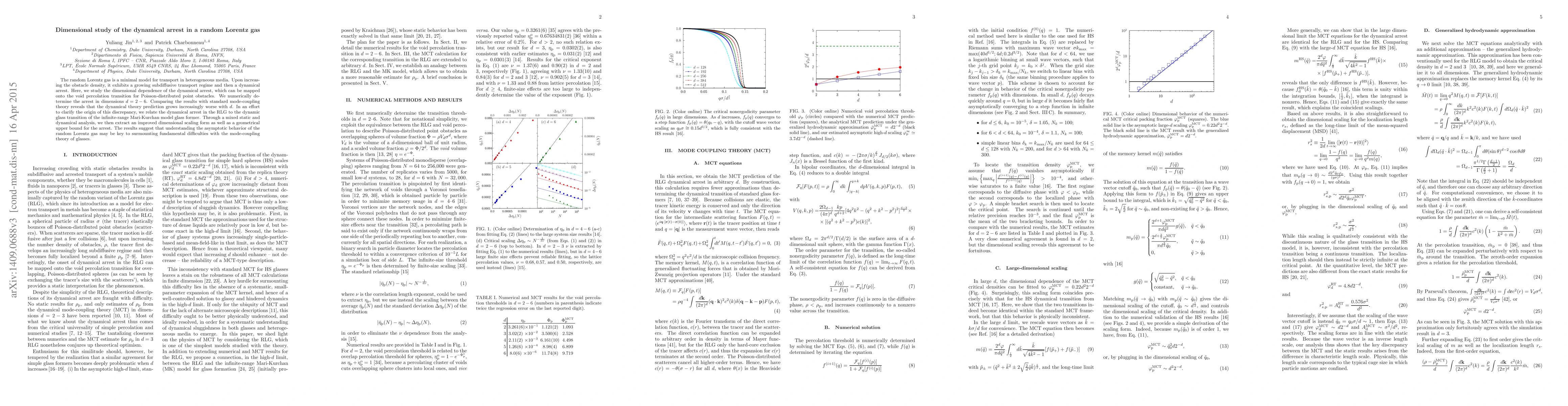 The random Lorentz gas is a minimal model for transport in heterogeneous media. Upon increasing the obstacle density, it exhibits a growing subdiffusive transport regime and then a dynamical arrest. Here, we study the dimensional dependence of the dynamical arrest, which can be mapped onto the void percolation transition for Poisson-distributed point obstacles. We numerically determine the arrest in dimensions d=2-6. Comparing the results with standard mode-coupling theory reveals that the dynamical theory prediction grows increasingly worse with $d$. In an effort to clarify the origin of this discrepancy, we relate the dynamical arrest in the RLG to the dynamic glass transition of the infinite-range Mari-Kurchan model glass former. Through a mixed static and dynamical analysis, we then extract an improved dimensional scaling form as well as a geometrical upper bound for the arrest. The results suggest that understanding the asymptotic behavior of the random Lorentz gas may be key to surmounting fundamental difficulties with the mode-coupling theory of glasses.