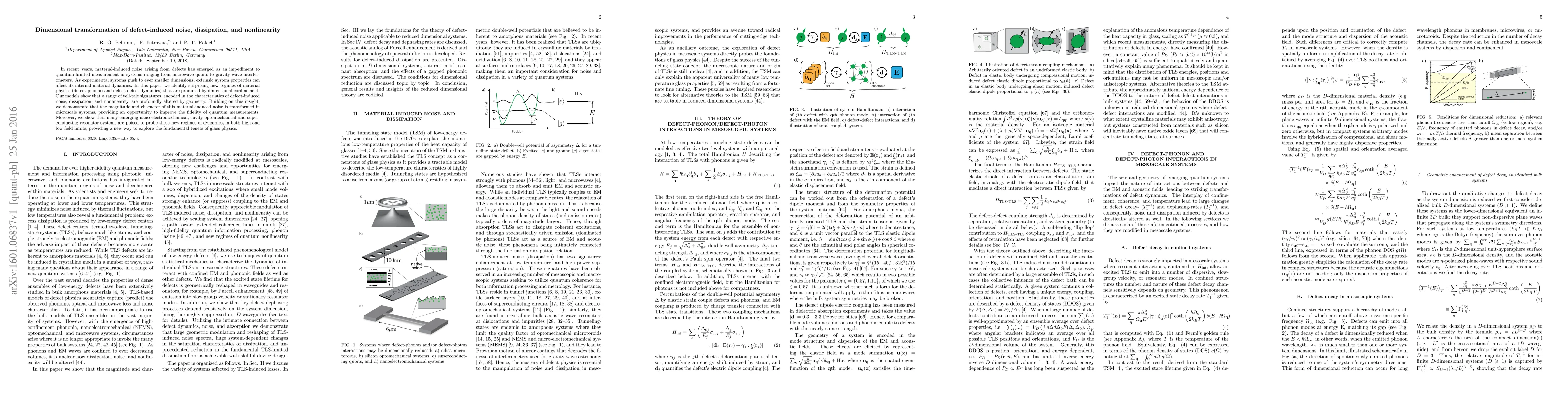 This paper discovers new regimes of material physics under dimensional confinement, transforming defect-induced noise, dissipation, and nonlinearity in microscale systems. It provides opportunities to improve quantum measurement fidelity and explores fundamental tenets of glass physics through emerging nano-electromechanical systems.