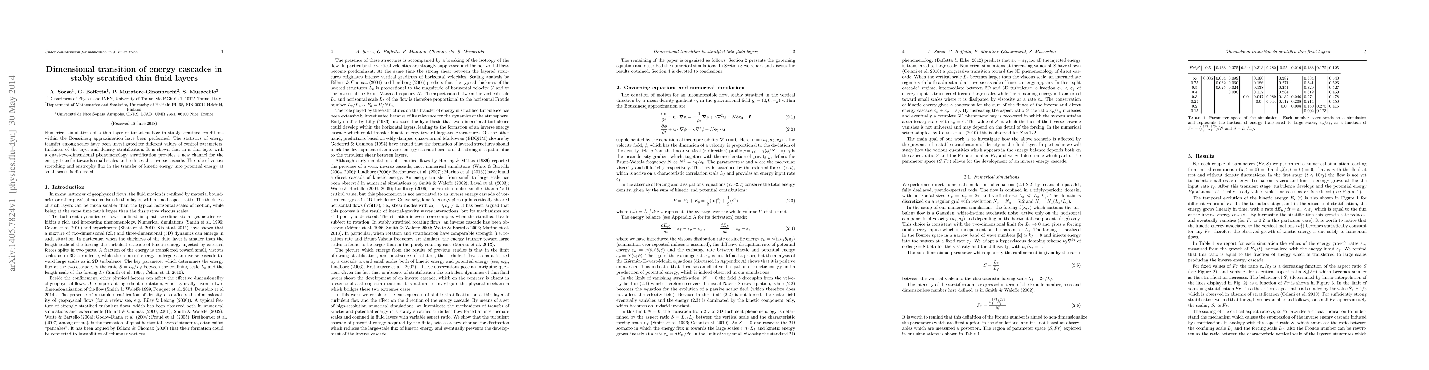This paper investigates the energy cascade dynamics in thin, stably stratified fluid layers using numerical simulations under the Boussinesq approximation. It finds that stratification introduces a new energy transfer pathway towards small scales and diminishes the inverse cascade, with vortex stretching and enstrophy flux playing key roles in converting kinetic energy into potential energy.