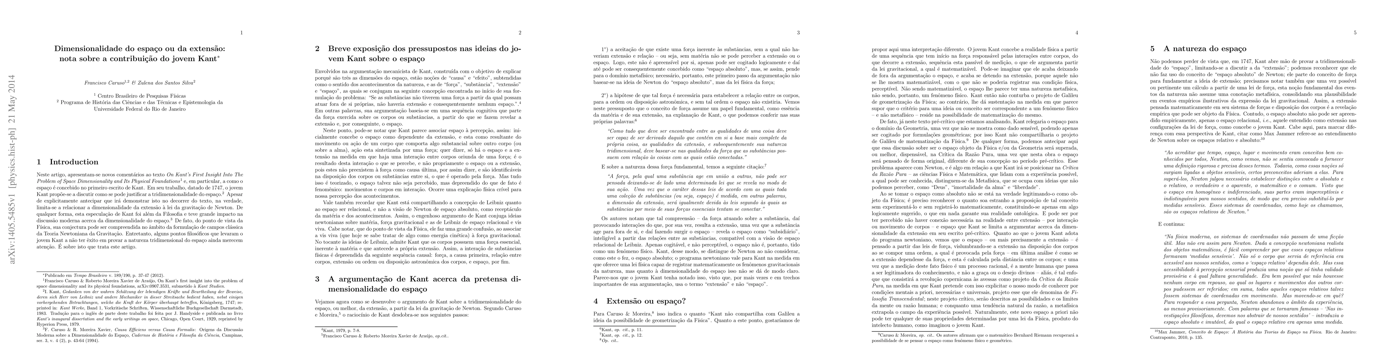 In this article, we present new comments to the article On Kant's First Insight Into The Problem of Space Dimensionality and Its Physical Foundations. In particular, we discuss how the space concept is designed in the first writing of Kant. In this work, dated 1747, the young Kant proposes to discuss how we can justify the three-dimensionality of space . Although he explicitly anticipates that this will demonstrate throughout the text, in fact, he merely relate the dimensionality of the extension to the law of gravitation. Anyway, this speculation went beyond Kant's Philosophy and had impact on the modern discussion about dimensionality of space. Indeed, from the point of view of physics, Kant's conjecture can be understood in the context of formulation of classical fields of Newtonian theory of gravitation. However, some philosophical points that led the young Kant did not succeed in proving the three-dimensional nature of space still deserve attention. This article is aimed to discuss them.