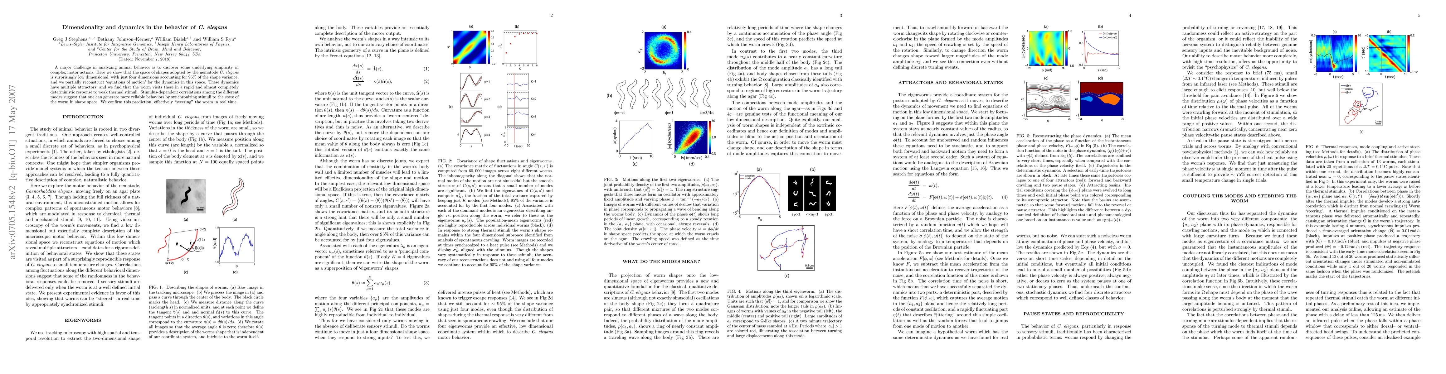 This study reveals that the complex motor actions of C. elegans can be described with just four dimensions, capturing 95% of shape variance. The researchers reconstruct "equations of motion" showing deterministic transitions between multiple attractors in response to thermal stimuli, and demonstrate real-time control of the worm's behavior by synchronizing stimuli with its state in shape space.