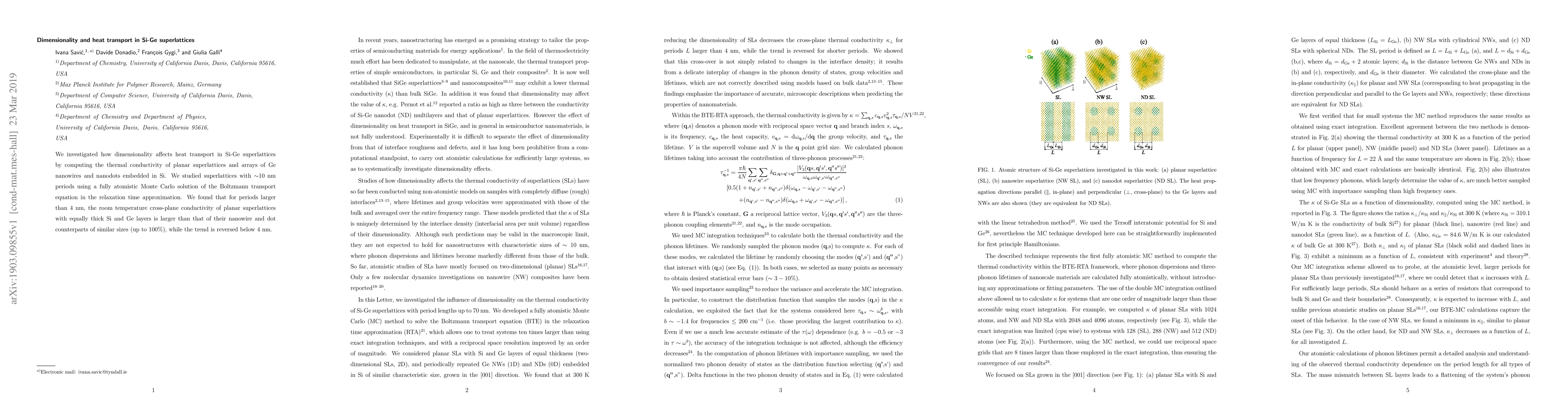 This study investigates the impact of dimensionality on heat transport in Si-Ge superlattices, comparing planar superlattices with Ge nanowires and nanodots in Si. For periods larger than 4 nm, planar superlattices exhibit greater cross-plane thermal conductivity than their nanostructured counterparts, but the trend reverses for smaller periods.