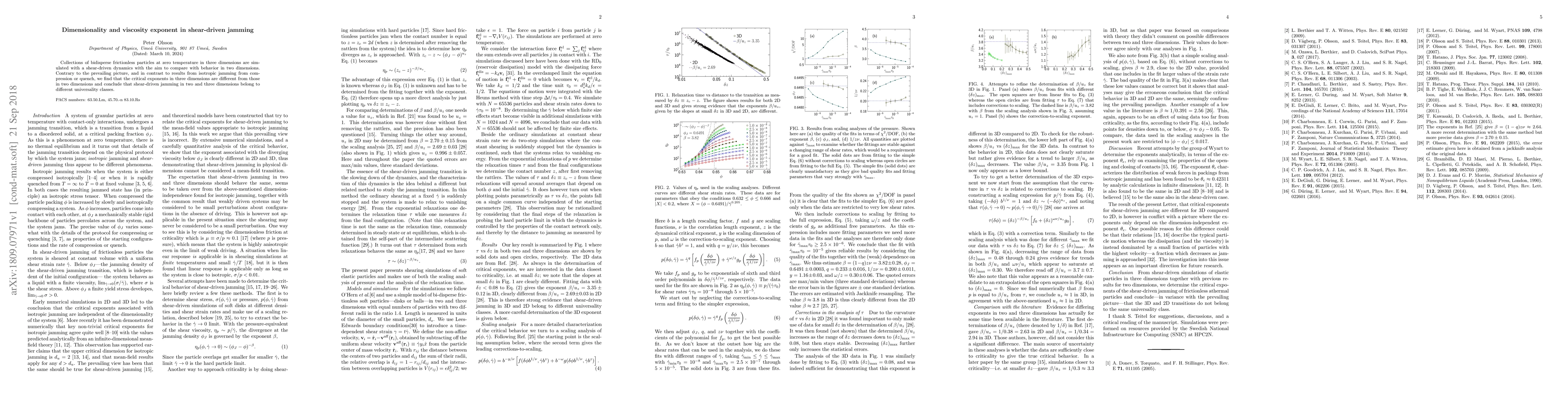 Collections of bidisperse frictionless particles at zero temperature in three dimensions are simulated with a shear-driven dynamics with the aim to compare with behavior in two dimensions. Contrary to the prevailing picture, and in contrast to results from isotropic jamming from compression or quench, we find that the critical exponents in three dimensions are different from those in two dimensions and conclude that shear-driven jamming in two and three dimensions belong to different universality classes.