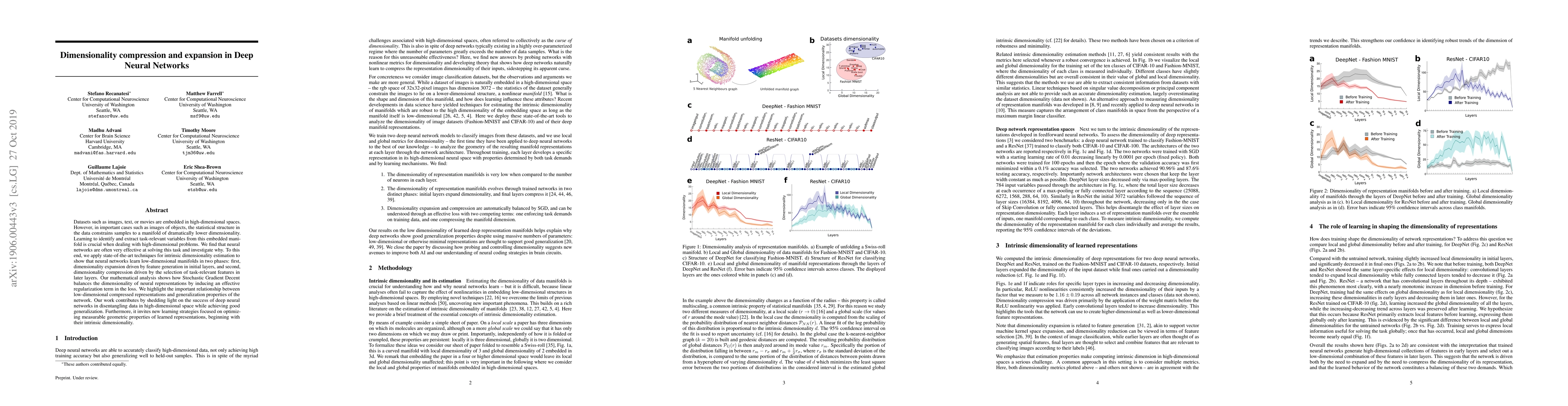Datasets such as images, text, or movies are embedded in high-dimensional spaces. However, in important cases such as images of objects, the statistical structure in the data constrains samples to a manifold of dramatically lower dimensionality. Learning to identify and extract task-relevant variables from this embedded manifold is crucial when dealing with high-dimensional problems. We find that neural networks are often very effective at solving this task and investigate why. To this end, we apply state-of-the-art techniques for intrinsic dimensionality estimation to show that neural networks learn low-dimensional manifolds in two phases: first, dimensionality expansion driven by feature generation in initial layers, and second, dimensionality compression driven by the selection of task-relevant features in later layers. We model noise generated by Stochastic Gradient Descent and show how this noise balances the dimensionality of neural representations by inducing an effective regularization term in the loss. We highlight the important relationship between low-dimensional compressed representations and generalization properties of the network. Our work contributes by shedding light on the success of deep neural networks in disentangling data in high-dimensional space while achieving good generalization. Furthermore, it invites new learning strategies focused on optimizing measurable geometric properties of learned representations, beginning with their intrinsic dimensionality.