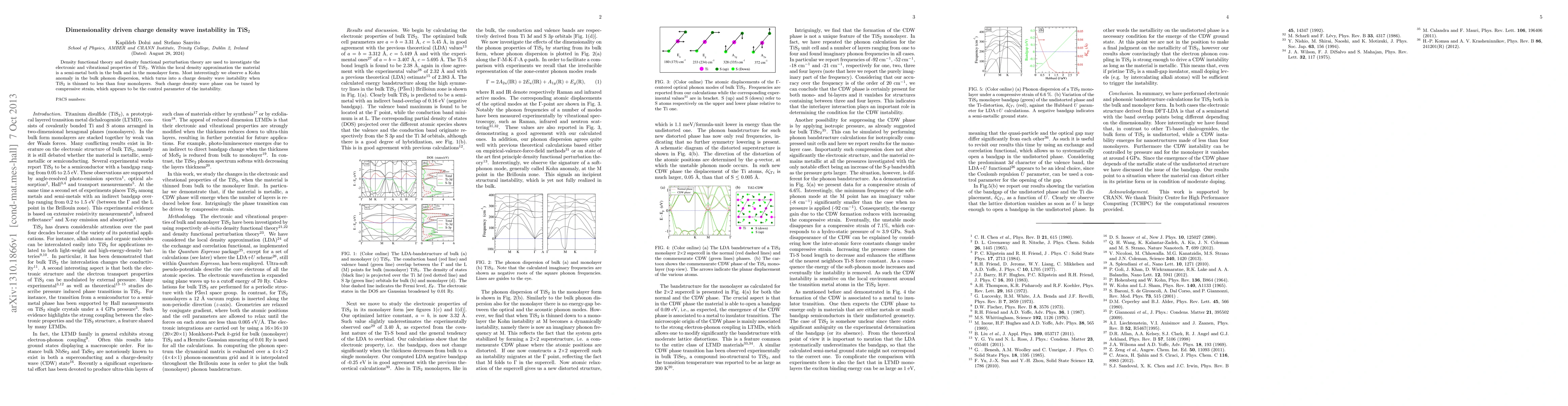 Density functional theory and density functional perturbation theory are used to investigate the electronic and vibrational properties of TiS$_2$. Within the local density approximation the material is a semi-metal both in the bulk and in the monolayer form. Most interestingly we observe a Kohn anomaly in the bulk phonon dispersion, which turns into a charge density wave instability when TiS$_2$ is thinned to less than four monolayers. Such charge density wave phase can be tuned by compressive strain, which appears to be the control parameter of the instability.
