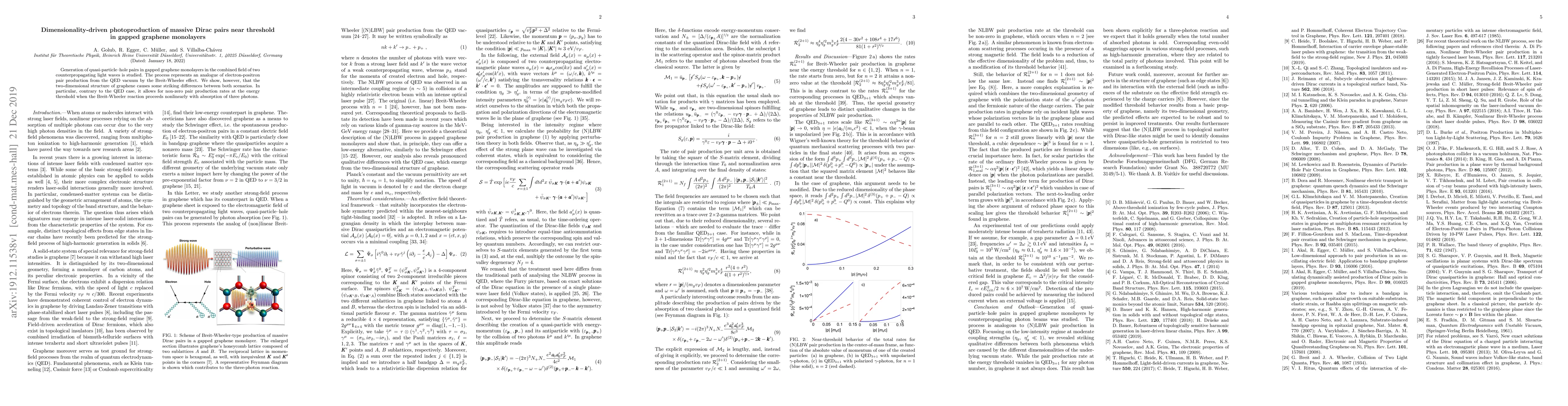 Generation of quasi-particle--hole pairs in gapped graphene monolayers in the combined field of two counterpropagating light waves is studied. The process represents an analogue of electron-positron pair production from the QED vacuum by the Breit-Wheeler effect. We show, however, that the two-dimensional structure of graphene causes some striking differences between both scenarios. In particular, contrary to the QED case, it allows for non-zero pair production rates at the energy threshold when the Breit-Wheeler reaction proceeds nonlinearly with absorption of three photons.