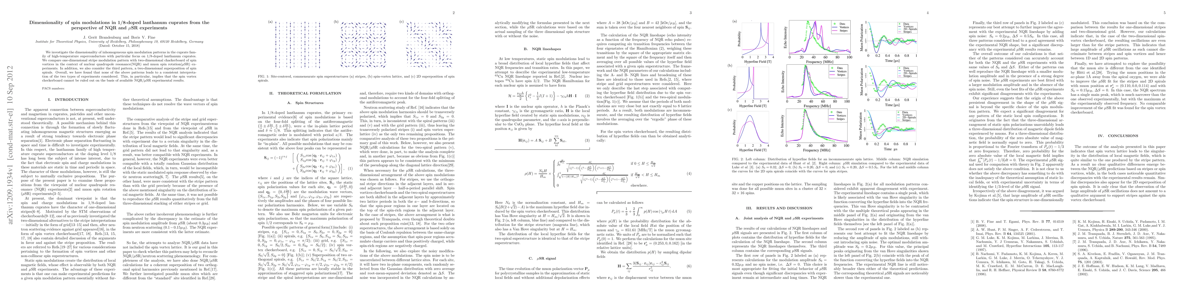 We investigate the dimensionality of inhomogeneous spin modulation patterns in the cuprate family of high-temperature superconductors with particular focus on 1/8-doped lanthanum cuprates. We compare one-dimensional stripe modulation pattern with two-dimensional checkerboard of spin vortices in the context of nuclear quadrupole resonance(NQR) and muon spin rotation(muSR) experiments. In addition, we also consider the third pattern, a two-dimensional superposition of spin spirals. Overall, we have found that none of the above patterns leads to a consistent interpretation of the two types of experiments considered. This, in particular, implies that the spin vortex checkerboard cannot be ruled out on the basis of available NQR/muSR experimental results.