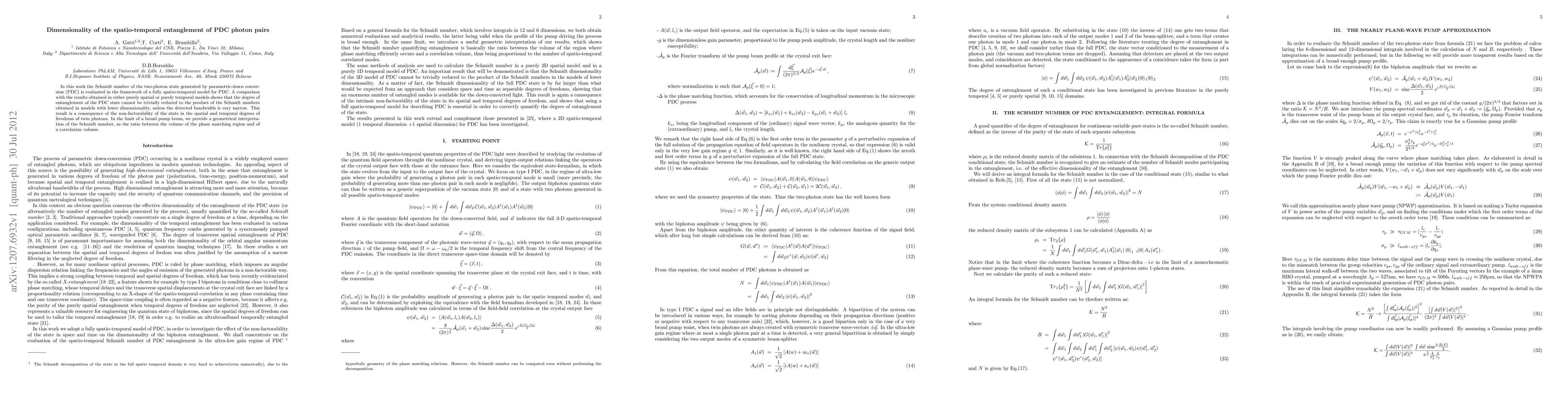 This paper evaluates the Schmidt number of PDC photon pairs in a full spatio-temporal model, demonstrating that the entanglement degree cannot be simplified from lower-dimensional models unless the detection bandwidth is narrow. It provides a geometrical interpretation of the Schmidt number as the ratio of phase matching and correlation volumes.