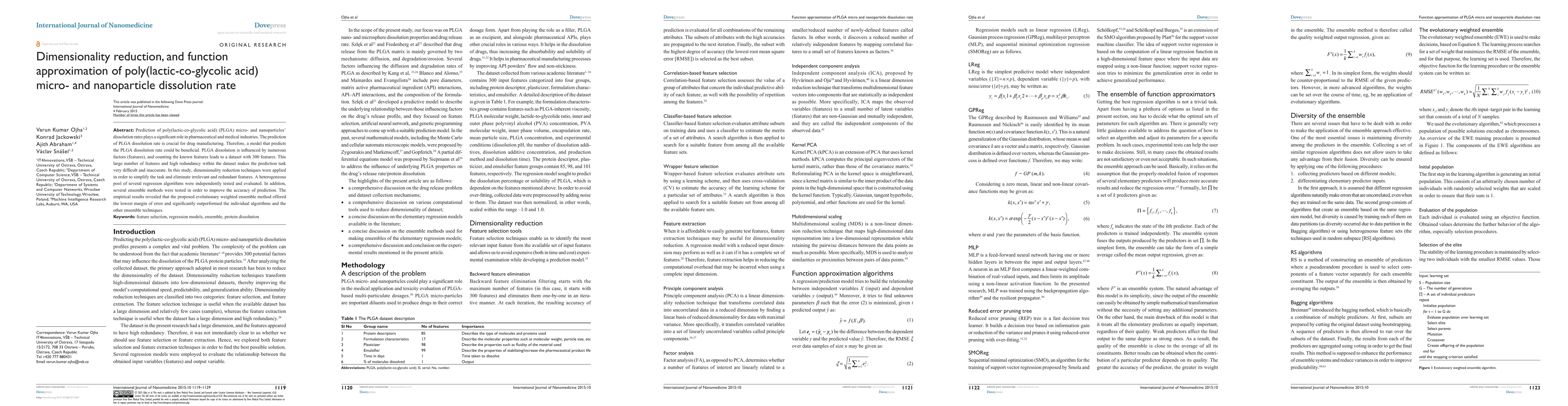 Prediction of poly(lactic co glycolic acid) (PLGA) micro- and nanoparticles' dissolution rates plays a significant role in pharmaceutical and medical industries. The prediction of PLGA dissolution rate is crucial for drug manufacturing. Therefore, a model that predicts the PLGA dissolution rate could be beneficial. PLGA dissolution is influenced by numerous factors (features), and counting the known features leads to a dataset with 300 features. This large number of features and high redundancy within the dataset makes the prediction task very difficult and inaccurate. In this study, dimensionality reduction techniques were applied in order to simplify the task and eliminate irrelevant and redundant features. A heterogeneous pool of several regression algorithms were independently tested and evaluated. In addition, several ensemble methods were tested in order to improve the accuracy of prediction. The empirical results revealed that the proposed evolutionary weighted ensemble method offered the lowest margin of error and significantly outperformed the individual algorithms and the other ensemble techniques.