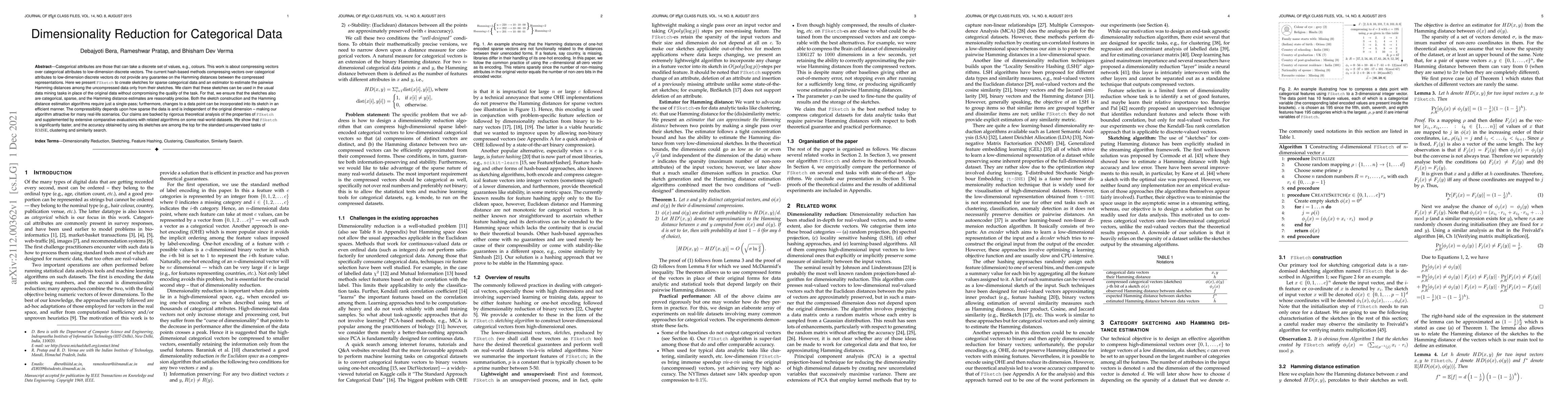 Categorical attributes are those that can take a discrete set of values, e.g., colours. This work is about compressing vectors over categorical attributes to low-dimension discrete vectors. The current hash-based methods compressing vectors over categorical attributes to low-dimension discrete vectors do not provide any guarantee on the Hamming distances between the compressed representations. Here we present FSketch to create sketches for sparse categorical data and an estimator to estimate the pairwise Hamming distances among the uncompressed data only from their sketches. We claim that these sketches can be used in the usual data mining tasks in place of the original data without compromising the quality of the task. For that, we ensure that the sketches also are categorical, sparse, and the Hamming distance estimates are reasonably precise. Both the sketch construction and the Hamming distance estimation algorithms require just a single-pass; furthermore, changes to a data point can be incorporated into its sketch in an efficient manner. The compressibility depends upon how sparse the data is and is independent of the original dimension -- making our algorithm attractive for many real-life scenarios. Our claims are backed by rigorous theoretical analysis of the properties of FSketch and supplemented by extensive comparative evaluations with related algorithms on some real-world datasets. We show that FSketch is significantly faster, and the accuracy obtained by using its sketches are among the top for the standard unsupervised tasks of RMSE, clustering and similarity search.