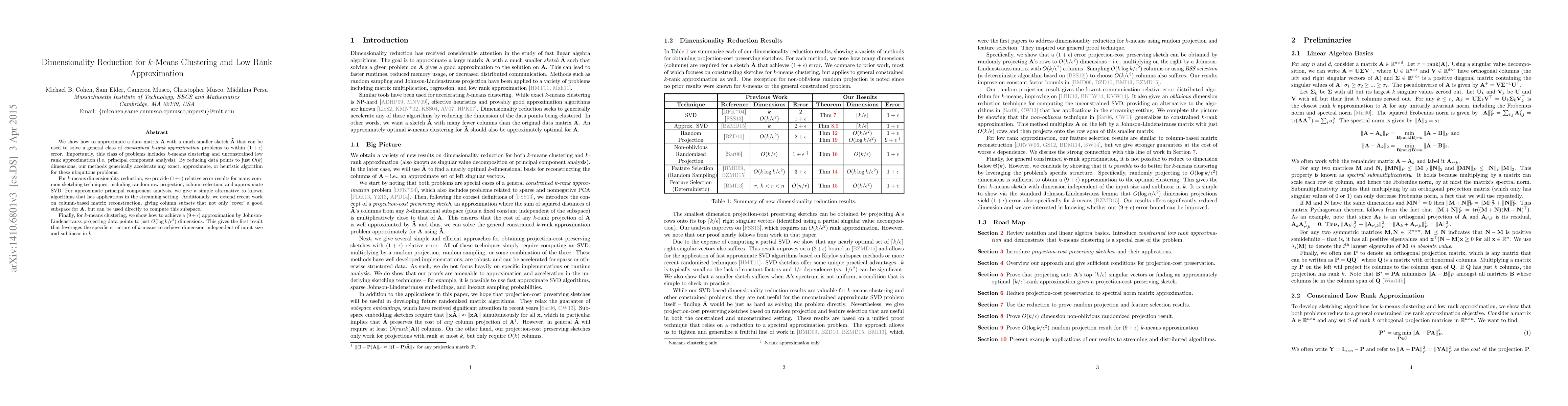 We show how to approximate a data matrix $\mathbf{A}$ with a much smaller sketch $\mathbf{\tilde A}$ that can be used to solve a general class of constrained k-rank approximation problems to within $(1+\epsilon)$ error. Importantly, this class of problems includes $k$-means clustering and unconstrained low rank approximation (i.e. principal component analysis). By reducing data points to just $O(k)$ dimensions, our methods generically accelerate any exact, approximate, or heuristic algorithm for these ubiquitous problems. For $k$-means dimensionality reduction, we provide $(1+\epsilon)$ relative error results for many common sketching techniques, including random row projection, column selection, and approximate SVD. For approximate principal component analysis, we give a simple alternative to known algorithms that has applications in the streaming setting. Additionally, we extend recent work on column-based matrix reconstruction, giving column subsets that not only `cover' a good subspace for $\bv{A}$, but can be used directly to compute this subspace. Finally, for $k$-means clustering, we show how to achieve a $(9+\epsilon)$ approximation by Johnson-Lindenstrauss projecting data points to just $O(\log k/\epsilon^2)$ dimensions. This gives the first result that leverages the specific structure of $k$-means to achieve dimension independent of input size and sublinear in $k$.