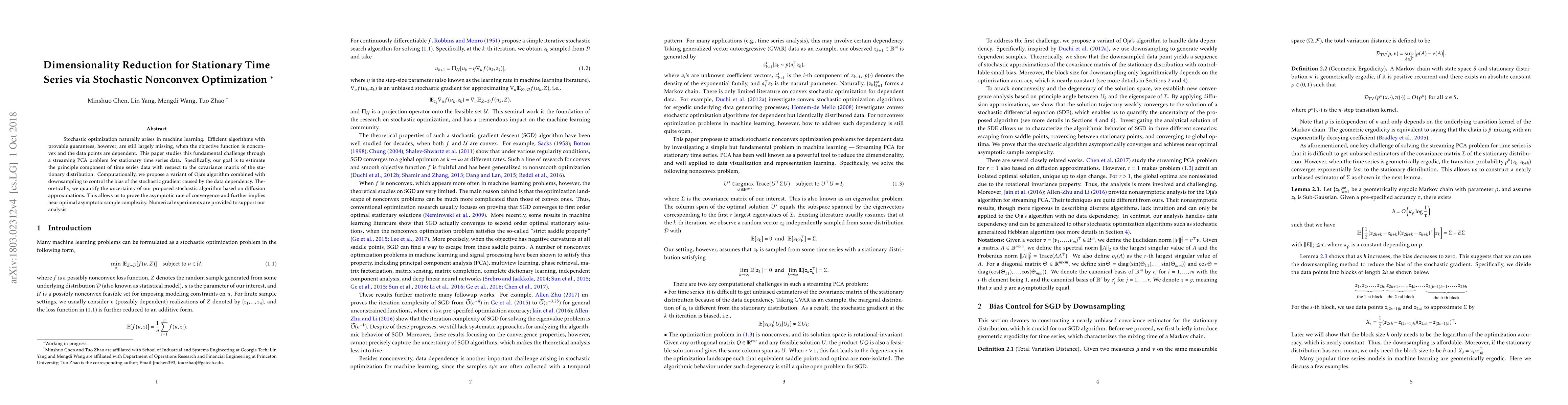 This paper proposes a stochastic nonconvex optimization method for dimensionality reduction in stationary time series data, specifically for streaming PCA. It combines a variant of Oja's algorithm with downsampling to manage bias from data dependency, and provides theoretical convergence guarantees and sample complexity analysis supported by numerical experiments.