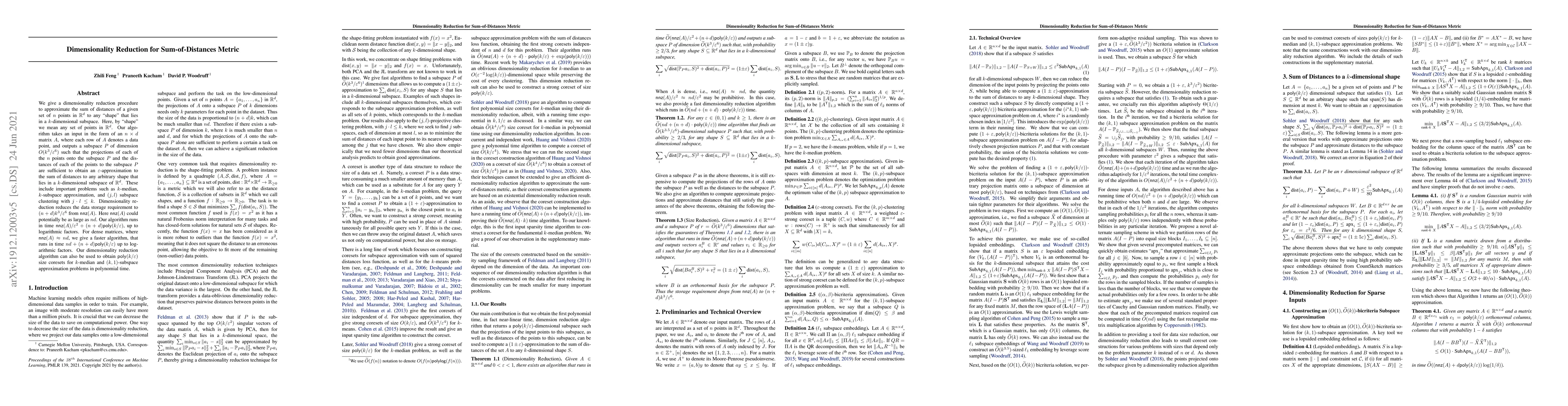 We give a dimensionality reduction procedure to approximate the sum of distances of a given set of $n$ points in $R^d$ to any "shape" that lies in a $k$-dimensional subspace. Here, by "shape" we mean any set of points in $R^d$. Our algorithm takes an input in the form of an $n \times d$ matrix $A$, where each row of $A$ denotes a data point, and outputs a subspace $P$ of dimension $O(k^{3}/\epsilon^6)$ such that the projections of each of the $n$ points onto the subspace $P$ and the distances of each of the points to the subspace $P$ are sufficient to obtain an $\epsilon$-approximation to the sum of distances to any arbitrary shape that lies in a $k$-dimensional subspace of $R^d$. These include important problems such as $k$-median, $k$-subspace approximation, and $(j,l)$ subspace clustering with $j \cdot l \leq k$. Dimensionality reduction reduces the data storage requirement to $(n+d)k^{3}/\epsilon^6$ from nnz$(A)$. Here nnz$(A)$ could potentially be as large as $nd$. Our algorithm runs in time nnz$(A)/\epsilon^2 + (n+d)$poly$(k/\epsilon)$, up to logarithmic factors. For dense matrices, where nnz$(A) \approx nd$, we give a faster algorithm, that runs in time $nd + (n+d)$poly$(k/\epsilon)$ up to logarithmic factors. Our dimensionality reduction algorithm can also be used to obtain poly$(k/\epsilon)$ size coresets for $k$-median and $(k,1)$-subspace approximation problems in polynomial time.